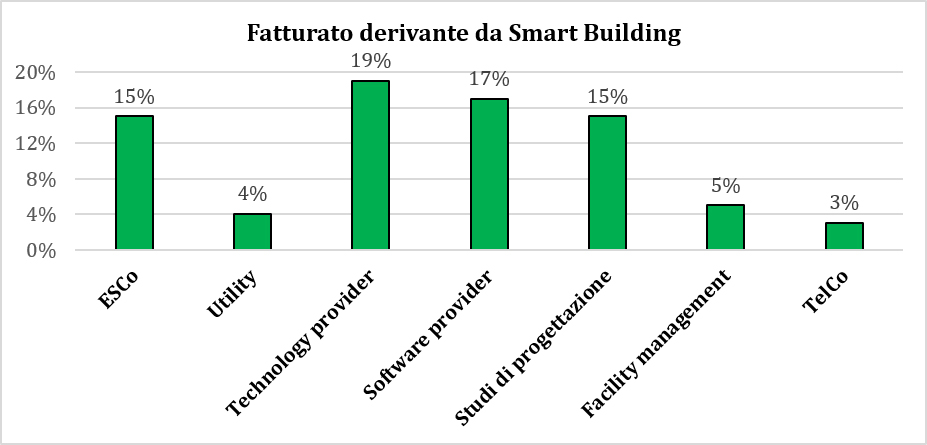 Smart Building Report 2019 | Grafico della quota di fatturato derivante da interventi in smart building per gli operatori analizzati (Esco, utility, technology provider, software provider, studi di progettazione, imprese di facility management e TelCo).