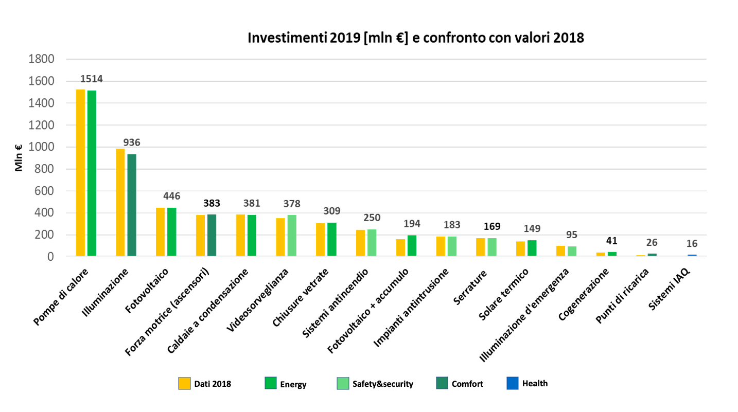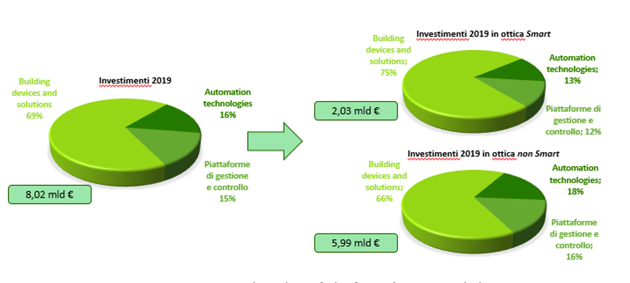 All’interno dei Building devices&solutions, che nel 2019 valgono il 69% degli investimenti totali (5,5 miliardi di euro su 8,2), il settore energetico continua a fare da traino (3 miliardi, pari al 55%), primato che si conferma anche nelle soluzioni più propriamente smart (800 milioni su 1,5 miliardi, cioè il 53,2%) a riprova di come l’efficientamento energetico e la produzione da fonti di energia rinnovabile siano ancora le tematiche preponderanti. I restanti 2,5 miliardi di investimenti totali sono suddivisi tra comfort (25%, 1,3 miliardi) e sicurezza (20%, 1,1 miliardi), mentre è ancora marginale (0,3%) il ruolo delle tecnologie legate alla salute.