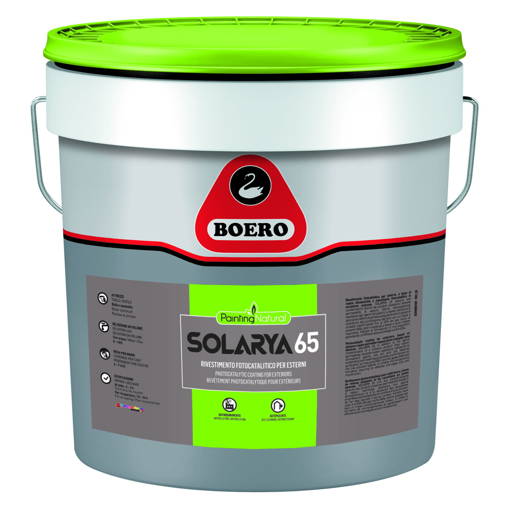 «Solarya65 è l’evoluzione nel mondo delle pitture per esterno. Il laboratorio Boero è riuscito a unire la tecnologia silossanica, che racchiude un’elevata resistenza in esterno, alla elevata idrorepellenza e traspirabilità della finitura implementando le più recenti nanotecnologie. Esse aggiungono la prestazione fotocatalitica, processo utile nell’azione di «bonifica» nei confronti dei principali inquinanti atmosferici, garantendo l’auto-pulizia delle facciate esterne di condomini, ville o qualsiasi supporto tinteggiabile».
