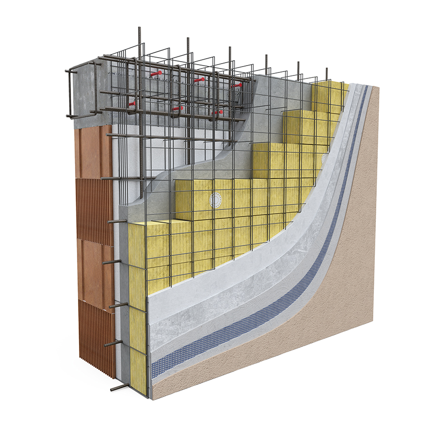 Geniale cappotto sismico è un sistema costruttivo costituito da una lastra sottile in calcestruzzo armato gettato in opera fra due strati di prodotti isolanti (selezionabili a piacimento fra polistirene espanso, estruso, lane minerali, sughero, lana di legno e resine fenoliche, a seconda delle esigenze e preferenze progettuali), pre-inseriti in una maglia tridimensionale in acciaio zincato.