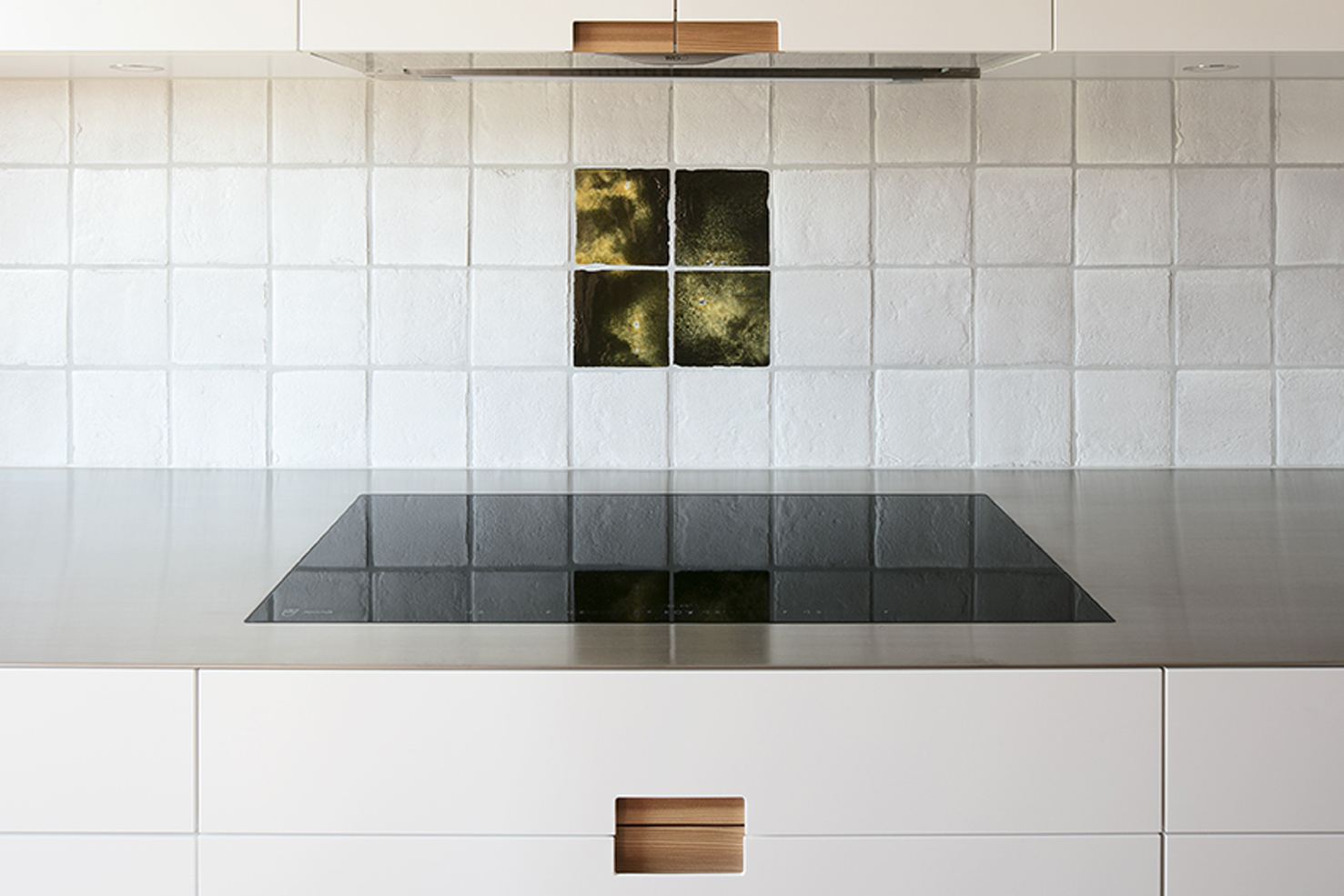 In cucina sono state inserite le mattonelle Just White Matt della Linea Ciari dei Lustri Veneziani che creano sfumature di bianco su bianco, ricche di cromie inespresse, donando infiniti riverberi in chiaro scuro.