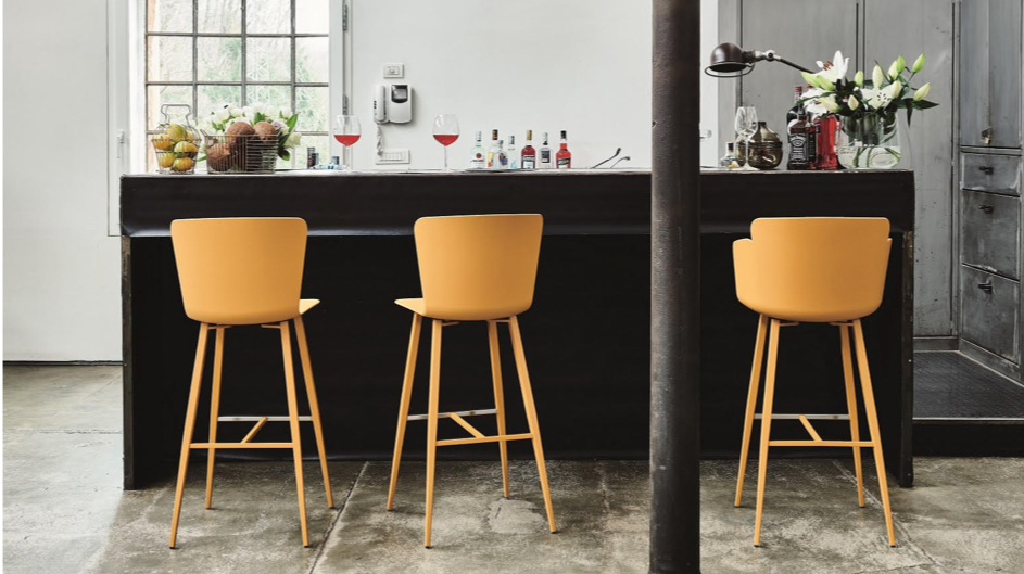 Oltre alle nuove basi, nasce la versione sgabello, perfetta per la cucina. Confortevole e molto stabile, lo sgabello è disponibile con scocca semplice o con braccioli, ed offre un comodo sostegno per i piedi, in tinta con il resto della struttura. Ampia la gamma di tessuti, pelli e similpelli disponibili per il rivestimento o per il cuscino opzionale di sedie e poltroncine.