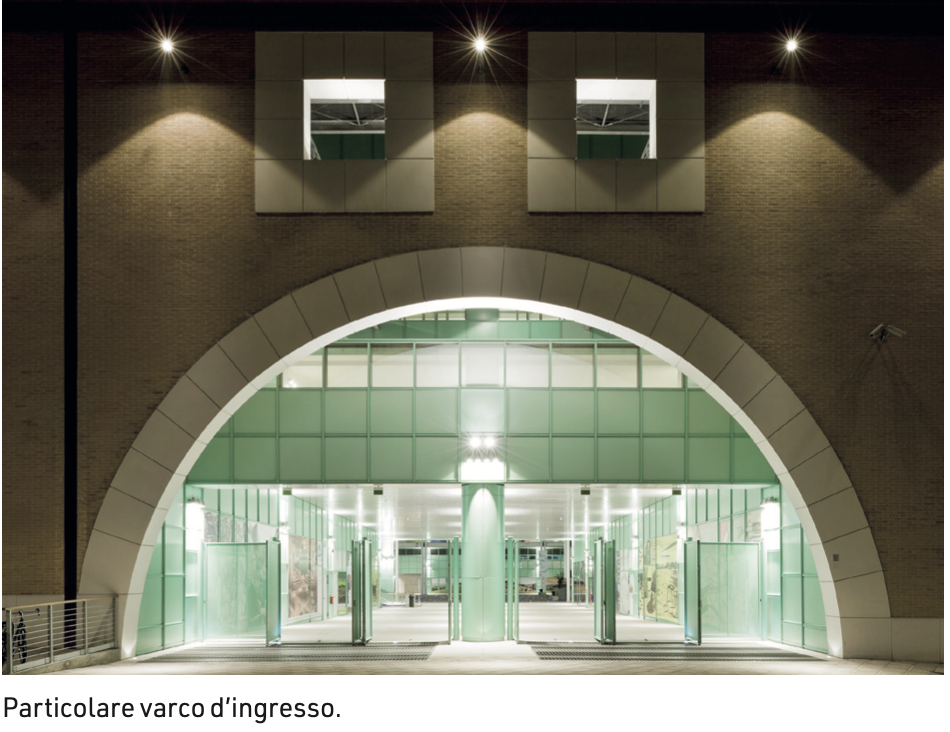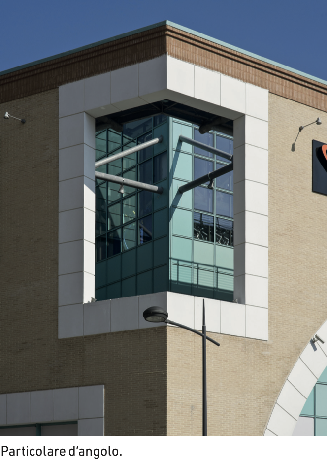 Con questo particolare di architettura viene risolta l’esigenza, tutta tecnica, di avere una sorta di “cammina- mento di ronda” che raccolga le passerelle metalliche di connessione delle uscite di sicurezza della palestra e delle multisale a quota +56.00, garantendo l’esodo sulla terrazza sicura al primo livello a quota +51.25 tramite scalette metalliche di sicurezza.