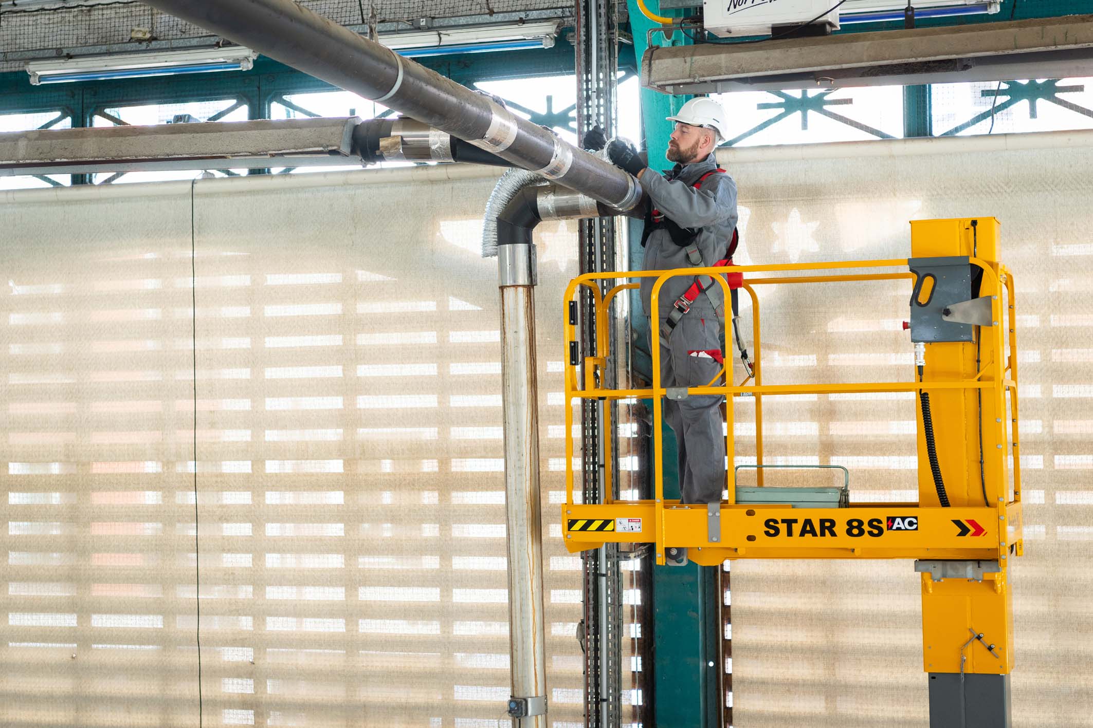 Star 8 S ha un’altezza di lavoro di 8 metri, una migliorata manovrabilità e rapidità, anche in ambienti di lavoro ristretti, con una maggiore sicurezza per l’operatore, grazie ai sistemi di sicurezza mobili (potholes/minigonne).