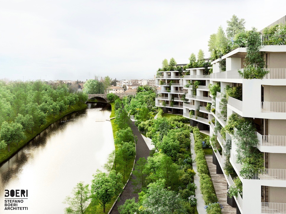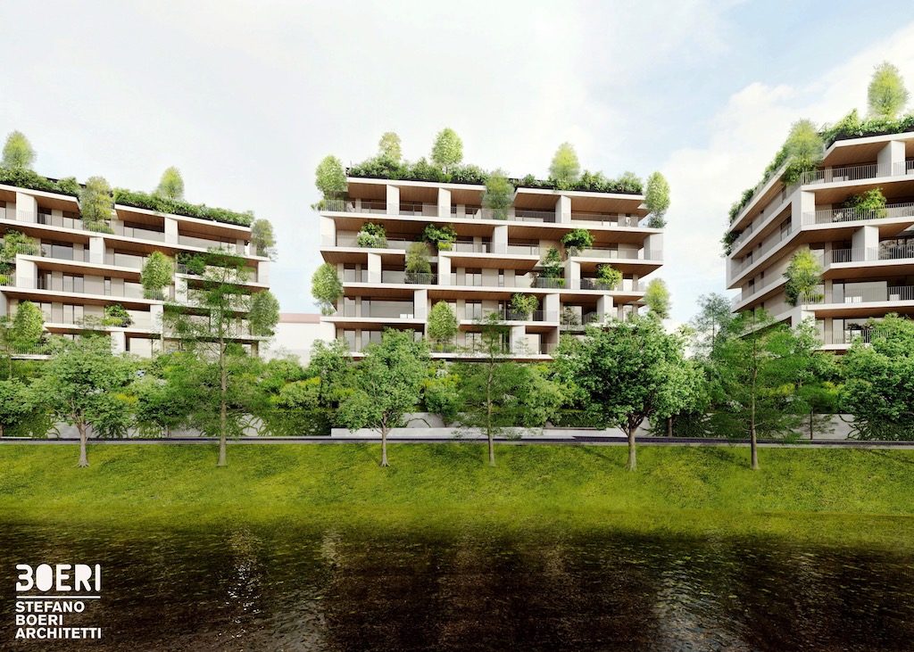 «Complessivamente il fronte che si compone è discontinuo ma permette ad ogni singolo edificio di beneficiare appieno del rapporto con il paesaggio; anche i parcheggi e i posti auto sono situati ad un livello semi-interrato ricoperti con terreno di riporto che permette di non interrompere la continuità dello spazio verde di pertinenza che si congiunge al verde pubblico del lungofiume». Marco Giorgio, Project Director di Stefano Boeri Architetti.