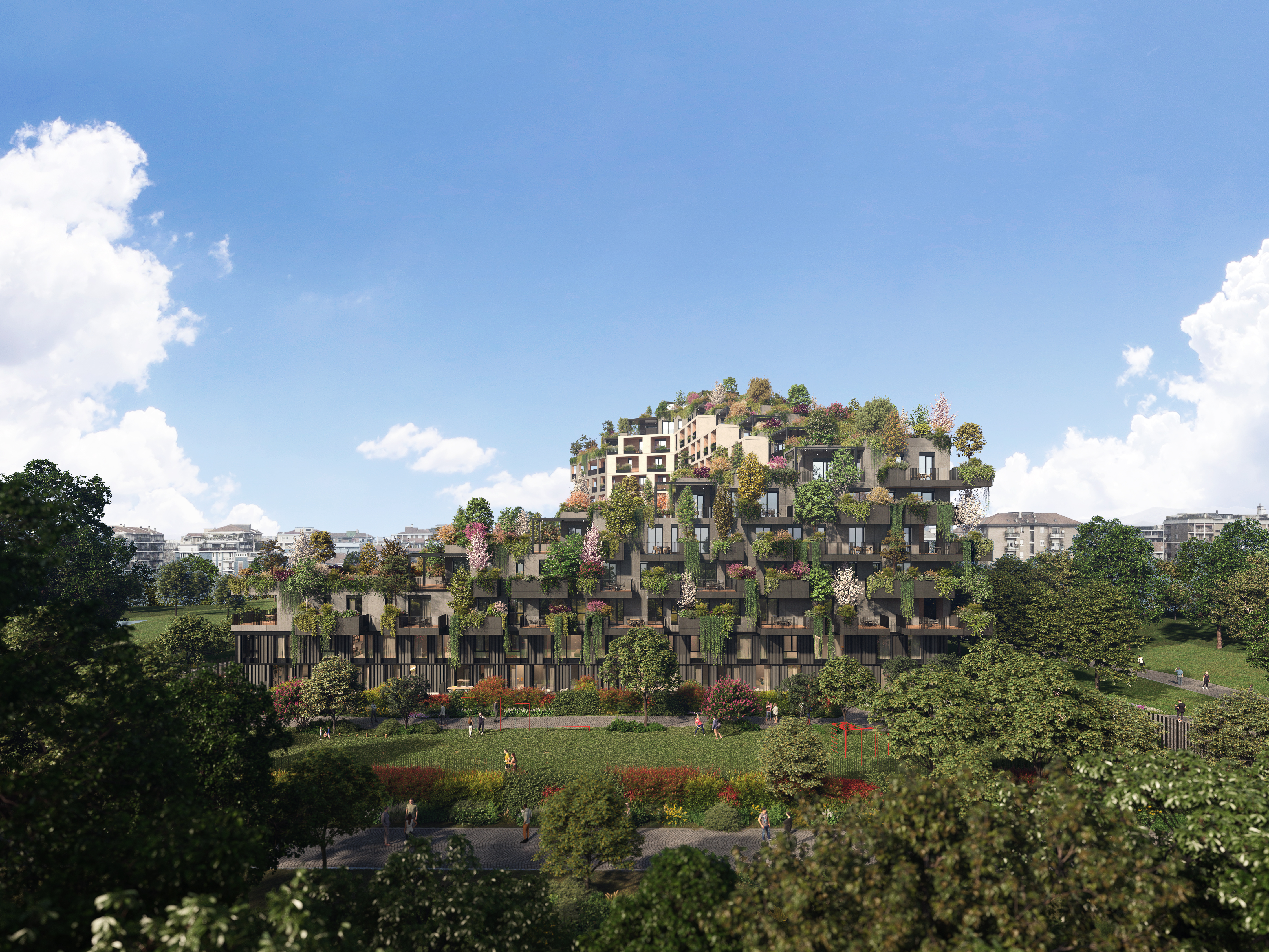 L’edificio è pensato come un corpo unitario racchiuso a corte e sviluppato tramite grandi gradonate che ospiteranno giardini e terrazze. In particolare la struttura progettuale prevede che le facciate siano caratterizzate (insieme alla copertura) da una cascata di verde lussureggiante. I fronti dell’edificio presenteranno un’altezza di 11 piani che andrà a digradare fino a 3 piani.