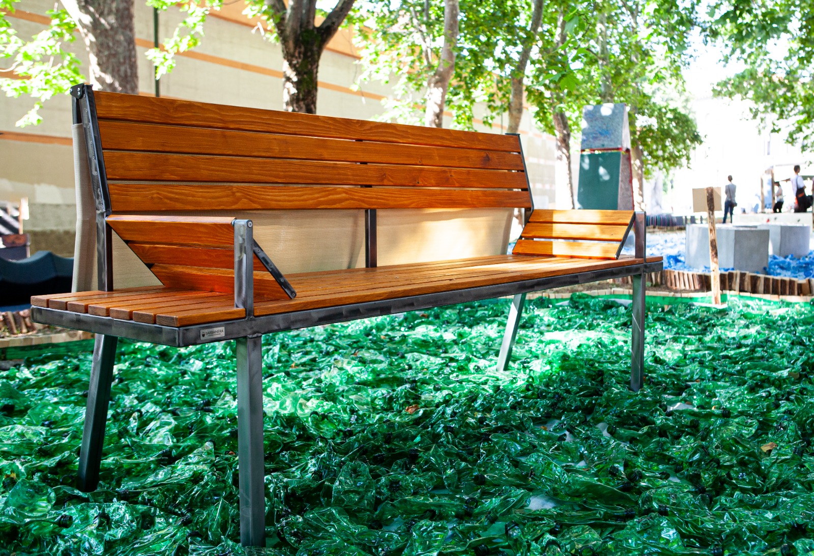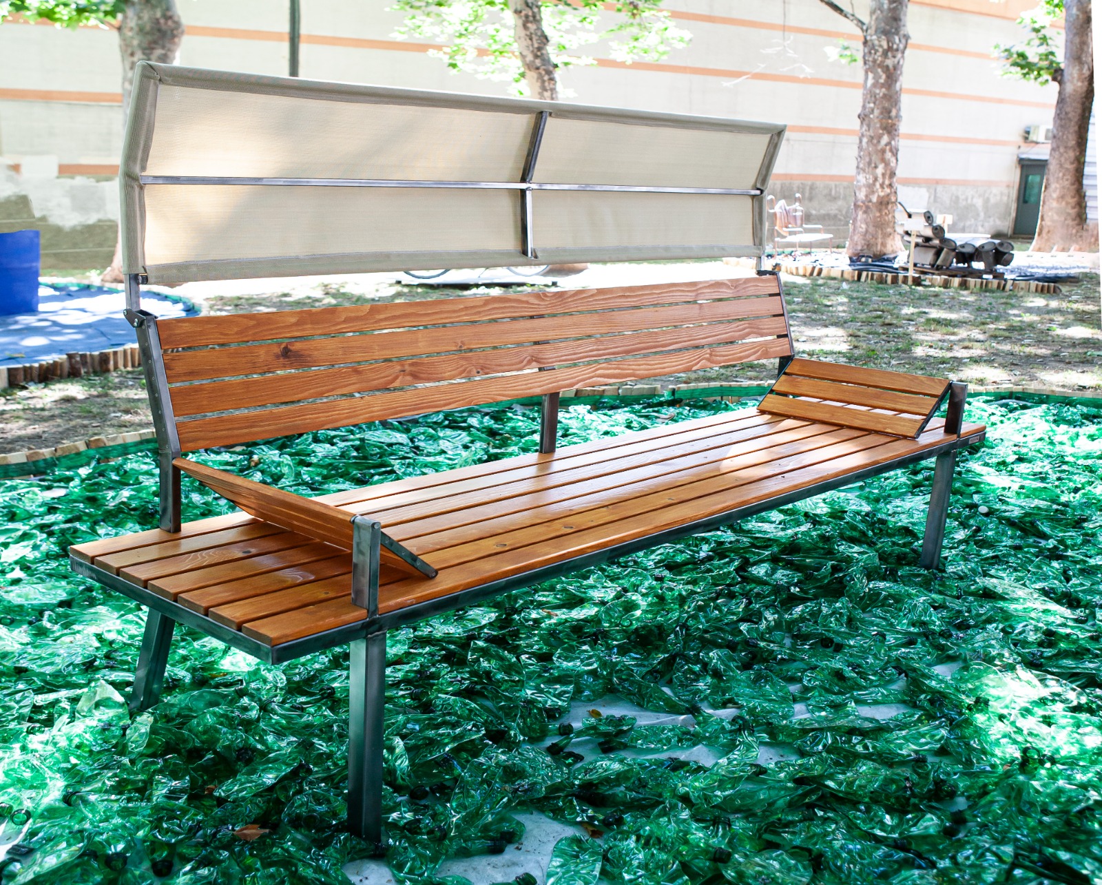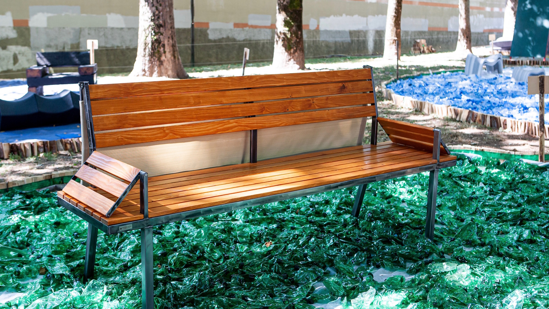 Lunga due metri, la “Panchina per per chi ha una casa e per chi non ce l’ha”si caratterizza per i due poggiabraccio dalle molteplici funzioni poggia/testa e per uno leggero pannello mobile montato sullo schienale che, all’occorrenza, diventa un utile riparo dal sole o dagli agenti atmosferici.
