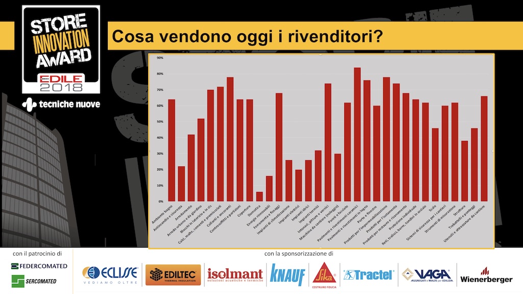 Al di là dei settori tradizionalmente presenti nelle rivendite – come Pavimenti e rivestimenti ceramici (84%), Collanti e ancoranti (78%), Prodotti per l’impermeabilizzazione, per l’isolamento, per il restauro e il risanamento, distribuiti, rispettivamente dal 78, dal 74 e dal 68 per cento, blocchi in laterizio e in cls (70%) calci, malte, cementi e premiscelati (72%) – il settore degli intonaci, pitture e vernici (74%) e quello delle porte e finestre (60%) hanno registrato un incremento, concomitante con la contrazione dei punti vendita specializzati in questi due settori. I prodotti per l’ambiente bagno sono trattati dal 64 per cento degli store, ma ciò che è da sottolineare è che, nell’ottica dell’offerta compresa del sistema casa, i punti vendita iniziano ad inserire nella propria gamma gli elementi di arredo (42%) e i materiali e sistemi per la realizzazione degli impianti termici (32%), di climatizzazione (26%), idrici (26%) ed elettrici (20%).