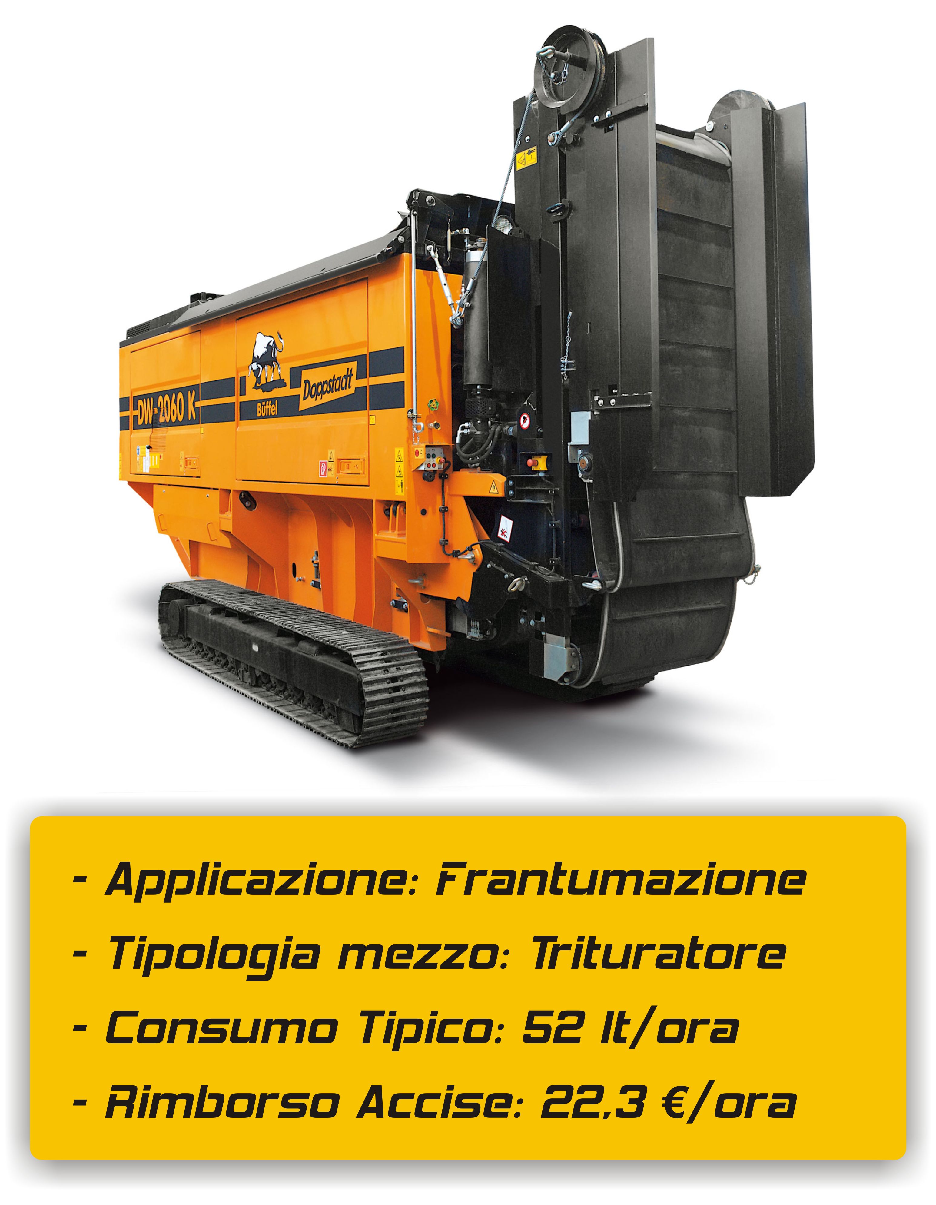- frantumatore consumo tipico: 52 litri/ora Rimborso Accise: 22,3 €/ora