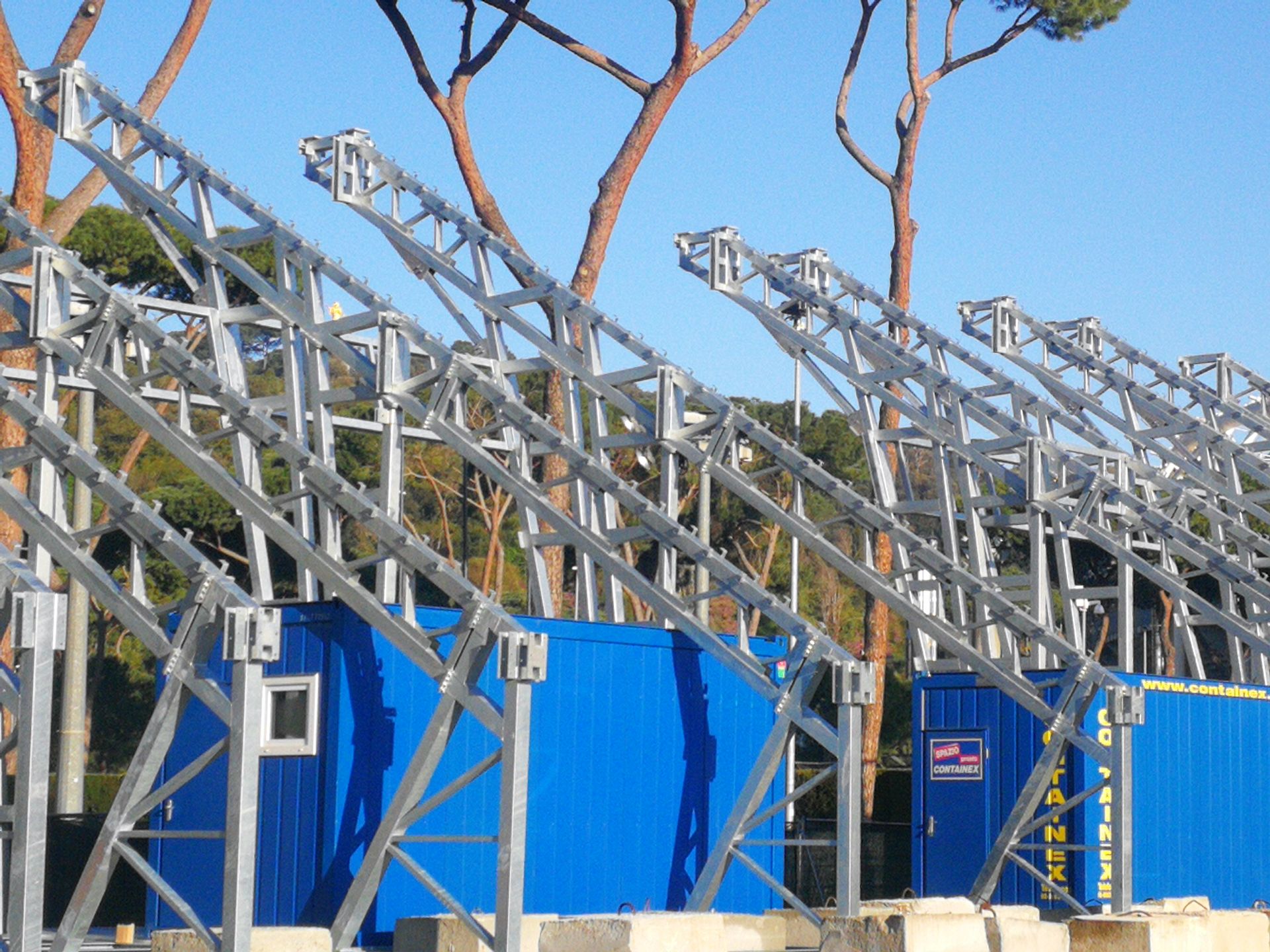 Il secondo elemento, fisicamente connesso al basamento, sono le capriate o cavalle. In tutto 68 elementi realizzati con profili scatolari a sezione quadra e misure variabili da 100×100 mm a 60×60 mm. Ogni capriata è una complessa opera di carpenteria ed è collegata al basamento e, alle strutture, a mezzo di piastre forate che supporteranno successivamente le imbullonature. L’altezza massima di ogni capriata è di 10,5 metri e, forma, nella sua altezza una spezzata di 30° circa.