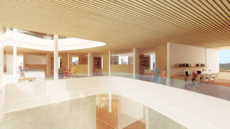La stessa forma dell’edificio disposto a semicerchio, accoglie in modo discreto, i fruitori che provengono dall’abitato collocando al piano terreno tutte le attività di tipo comunitario (sala esposizioni, amministrazione, auditorium, mensa, palestre) e ai piani superiori le attività didattiche.