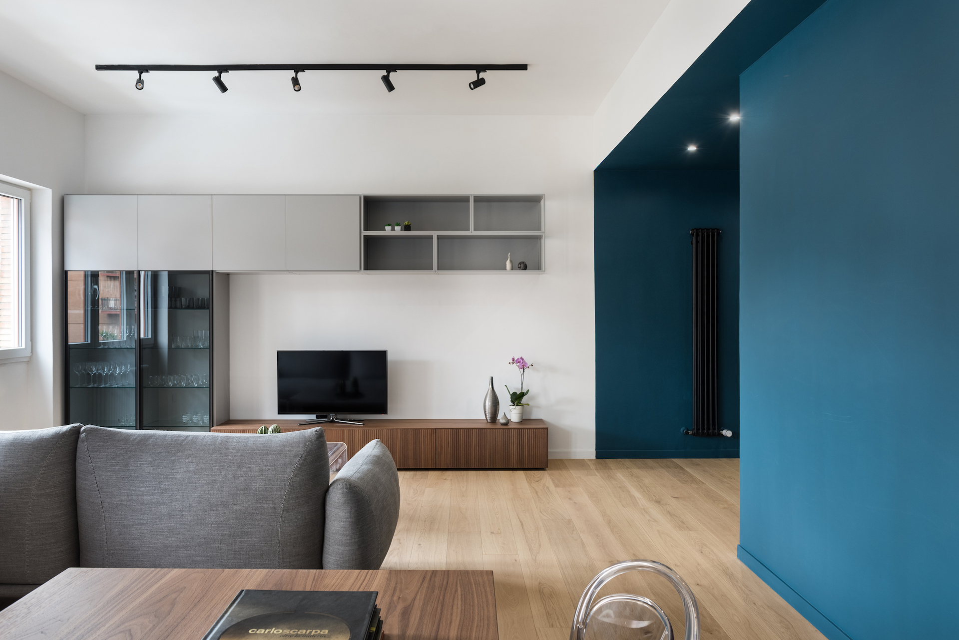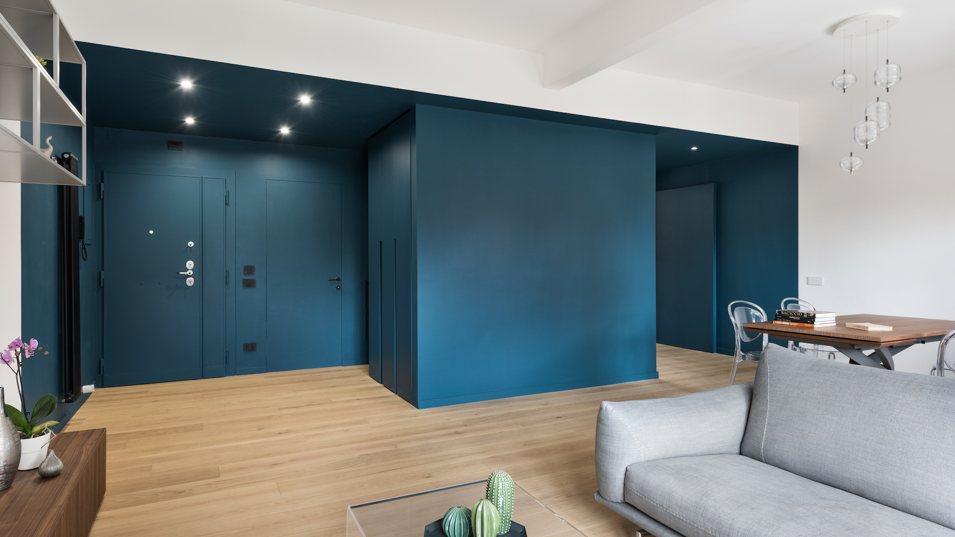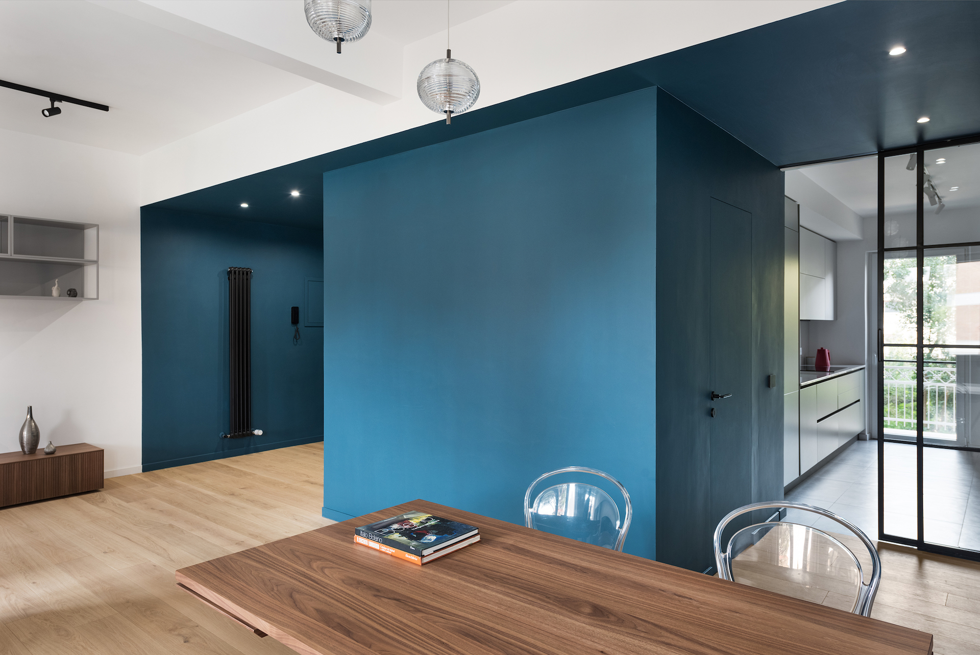 Un appartamento romano si colora di un intenso blue navy, una tonalità profonda ed elegante che tinge alcune pareti della zona giorno dando vita ad un gioco architettonico di pieni e di vuoti