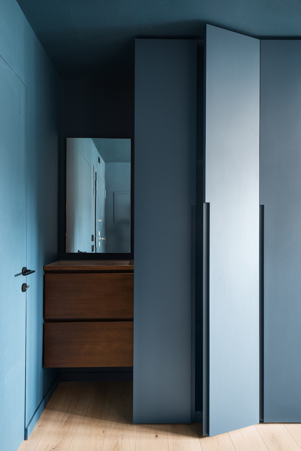Creare quindi un elemento architettonico predominante che fungesse da perno su cui ruotino tutti gli ambienti della casa e che, con la sua connotazione cromatica blu scuro, potesse esaltare la luminosità del soggiorno. Così si è venuto a delineare questo grande parallelepipedo dalla doppia funzionalità: verso l’ingresso è stato attrezzato come un piccolo guardaroba con un elemento contenitore e uno specchio, verso la cucina ha un’apertura che conduce al secondo bagno cieco.