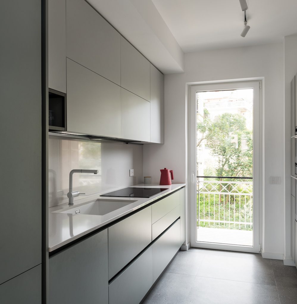 Adiacente ad esso si apre una cucina luminosa e minimale separata visivamente dalla zona giorno grazie solo ad una vetrata scorrevole a tutta altezza. L’accesso alla zona notte avviene attraverso uno porta scorrevole ben mimetizzata con una delle pareti presenti nel soggiorno. Al suo interno una distribuzione degli ambienti che è rimasta pressoché identica a quella originaria e che ospita due ampie camere da letto e un grande bagno dove il tema del colore si ripresenta sotto forma di un lavabo rigorosamente in tonalità blue navy.