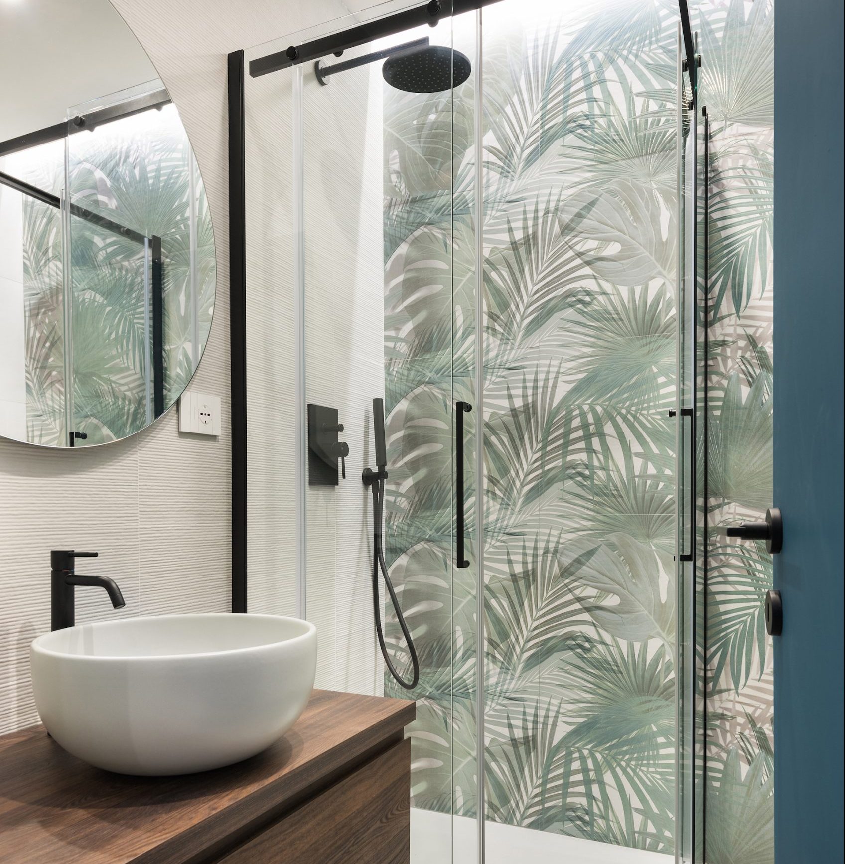 (Il bagno adiacente al soggiorno, inserito nel volume tinteggiato blu navy si caratterizza per una inaspettata parete a motivi tropicali in gres porcellanato (Milano Mood, Tropical Verde) Il pavimento (Color Line, Rope Perla) e la parete a sinistra (Milano Mood, Ghiaccio) è rivestita con piastrelle sempre di Fap Ceramiche. I mobili bagno sono di Arbi. Foto Paolo Fusco).