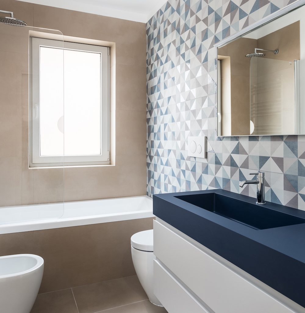 (Il bagno della zona notte, di dimensioni maggiori, ha un’intera parete rivestita in piastrelle con motivi geometrici (Milano Mood, Texture triangoli) di Fap ceramiche. Un grande lavabo dalle forme rigorosamente geometriche riprende quella nuance blue navy che fa da protagonista nella zona giorno. Sulla parete di fondo piastrelle Milano Mood, Biscotto e a pavimento Milano Mood, Biscotto, tutto di Fap Ceramiche. I mobili bagno sono di Arbi. Foto Paolo Fusco)