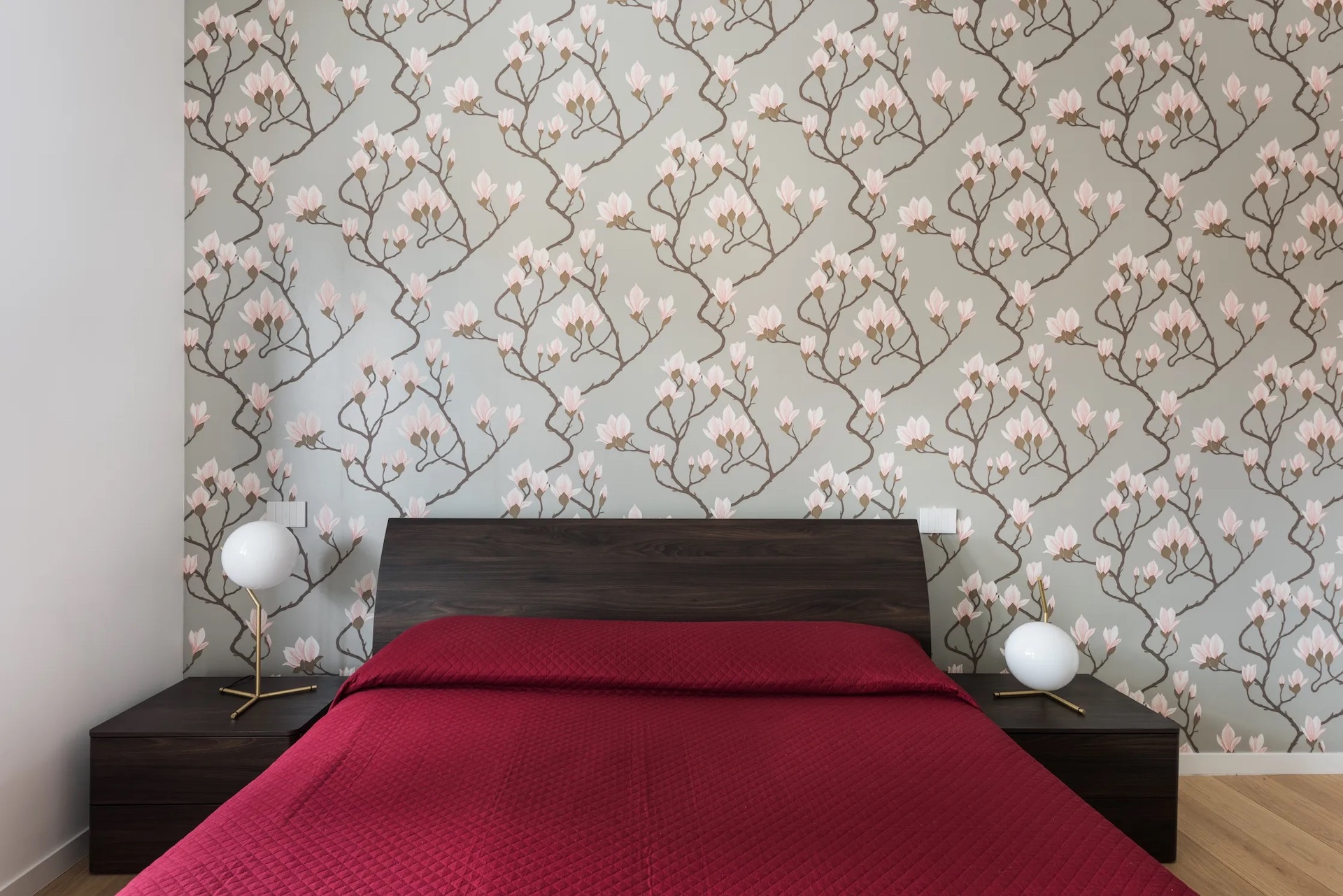 (Nella camera padronale una grande parete tappezzata con una carta da parati floreale a cui sono stati accostati degli arredi in legno scuro. Sui comodini le eleganti lampade IC Lights Table 1 Low e High di Flos. Foto Paolo Fusco)
