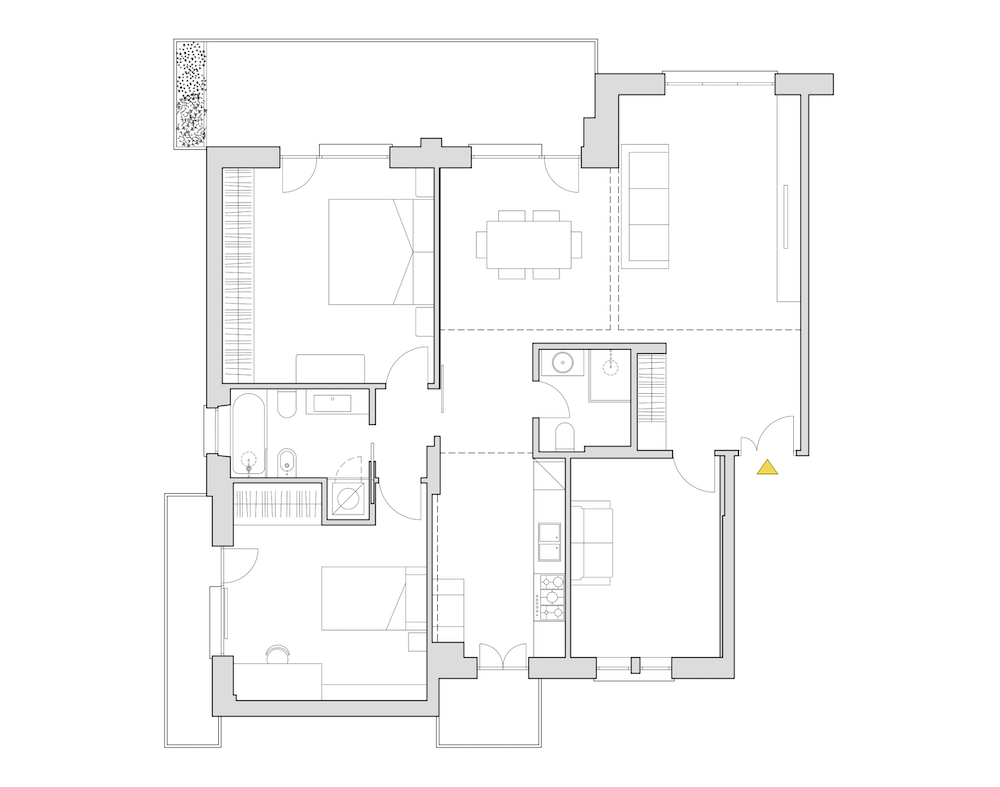 L’intervento progettuale è partito dalla necessità funzionale di unificare la zona giorno, creando un unico grande ambiente aperto e connesso alla cucina grazie ad una porta vetrata scorrevole. Questo, attraverso un attento progetto di demolizioni e ricostruzioni, ha permesso anche di identificare un ambito notte più intimo e isolato, caratterizzato dalla presenza di due camere da letto e un grande bagno.