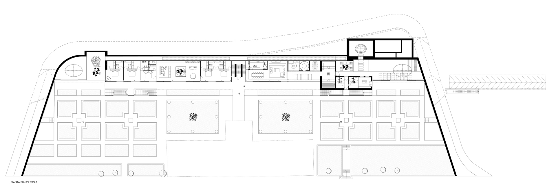 Diviso dal giardino all’italiana, ma collegato alla Villa da una passerella di 15 m, si incastona nella collina un’architettura contemporanea di due piani (di cui uno soltanto parzialmente fuori terra), caratterizzata dalla presenza di un tetto giardino di 1.200 mq, su cui sono state previste essenze arboree autoctone.