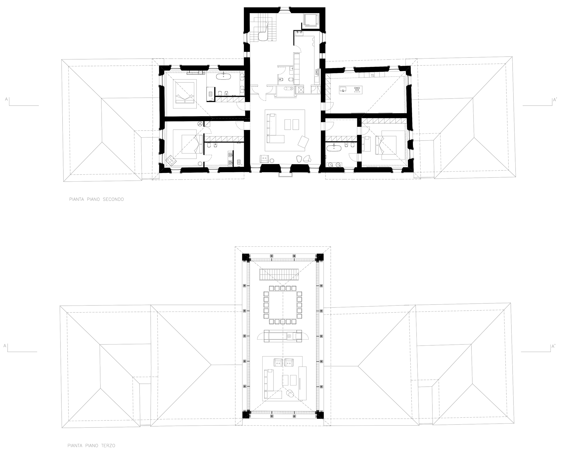Distribuiti al suo interno troviamo: la Spa di 500 mq, le 4 suites per gli ospiti e un giardino d’inverno su un doppio volume, che si collega al parcheggio interrato per 20 autoveicoli, a ridosso dello scavo a monte.