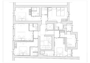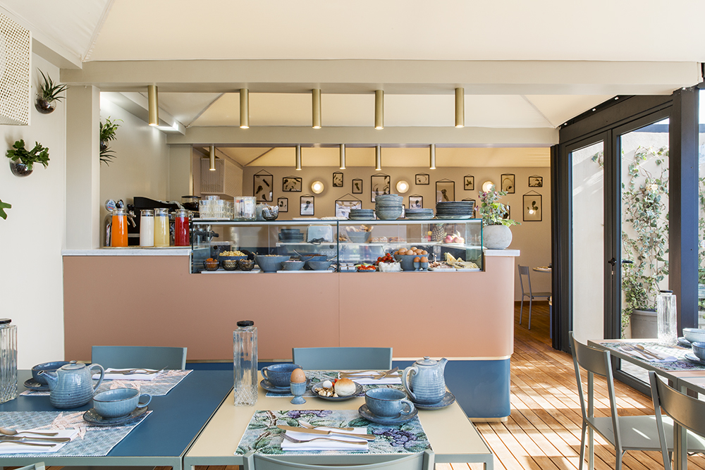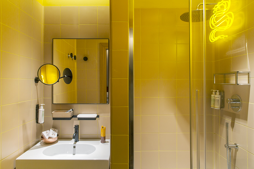 Per consolidare il rapporto con il quartiere, al piano terra sono stati mantenuti il bar-bistrot e il ristorante. Minimi gli interventi sulle murature, quasi sempre portanti, fatta eccezione per l’ampliamento dei bagni esistenti per creare delle docce più ampie. L’intervento si è concentrato sul trattamento delle superfici e sul disegno degli arredi.
