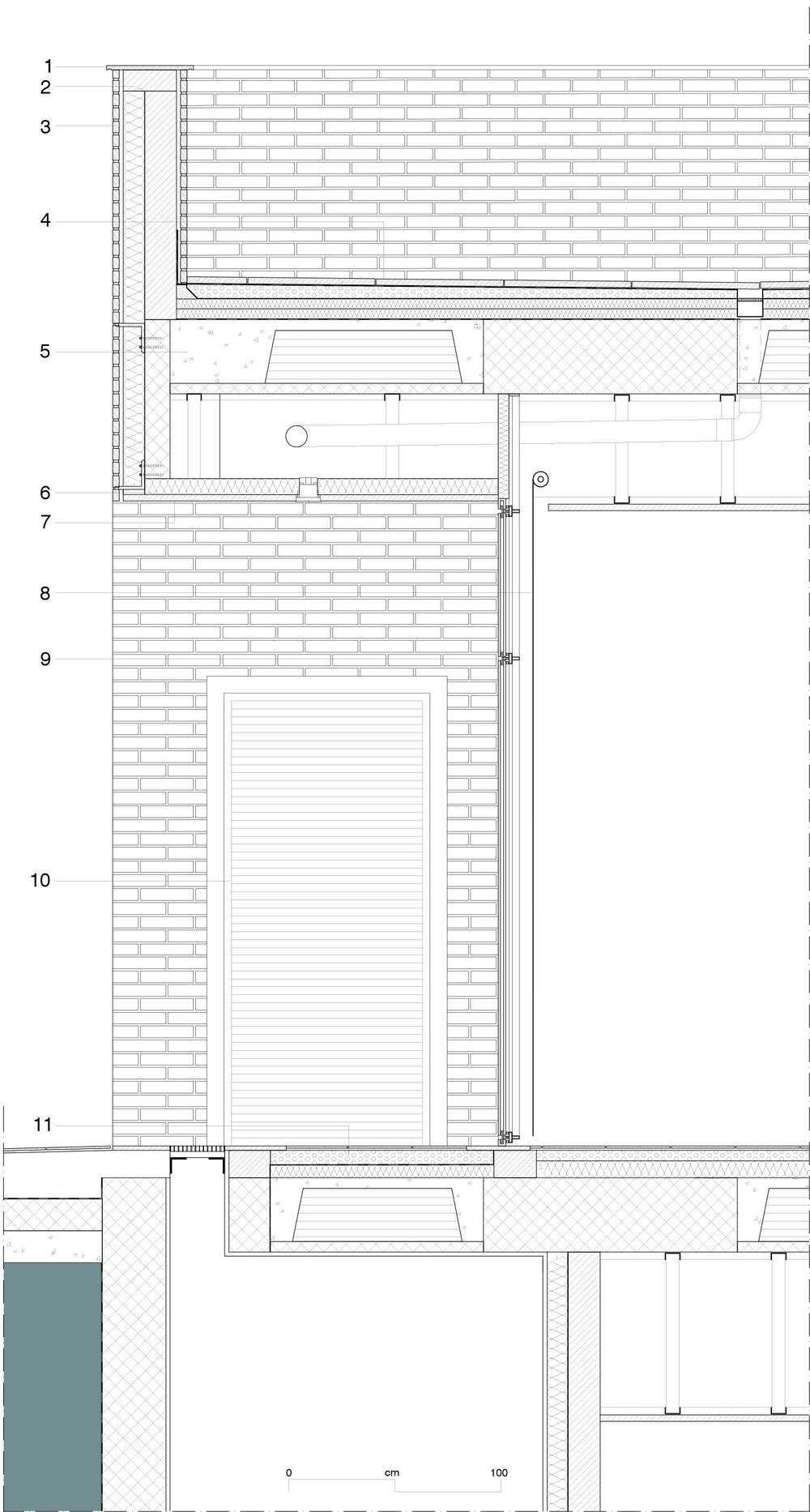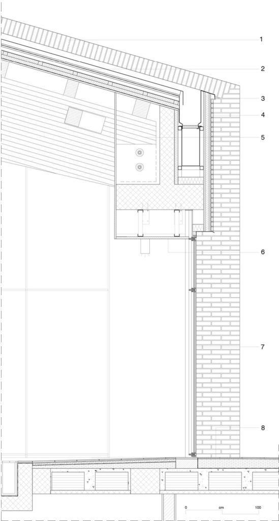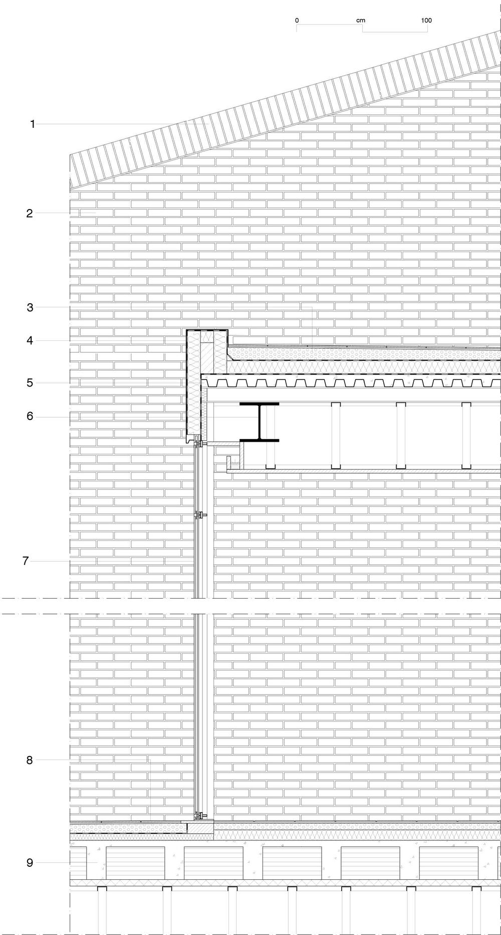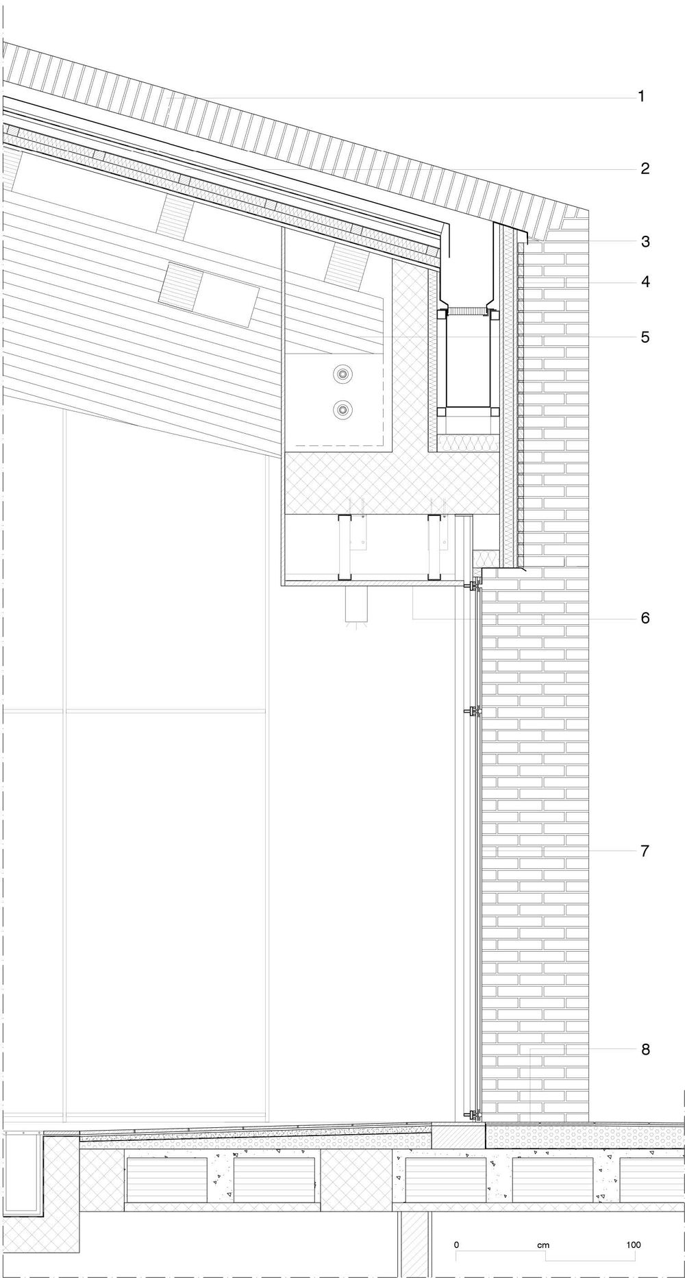 Dettaglio 1: Sezione verticale del fronte sud-ovest del volume destinato a palestra.