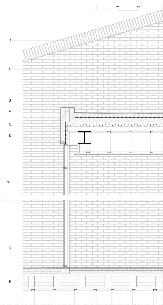 Al fine di ottenere una particolare vibrazione della muratura i mattoni e i listelli hanno una colorazione disomogenea che varia dal giallo al salmone. Le pareti che si affacciano nella galleria presentano lo stesso rivestimento in mattoni faccia a vista delle pareti esterne, sottolineandola versatilità del laterizio nelle diverse situazioni di impiego. Dal punto di vista costruttivo il volume a doppia falda ha una struttura portante in cemento armato che sorregge le travi di copertura.