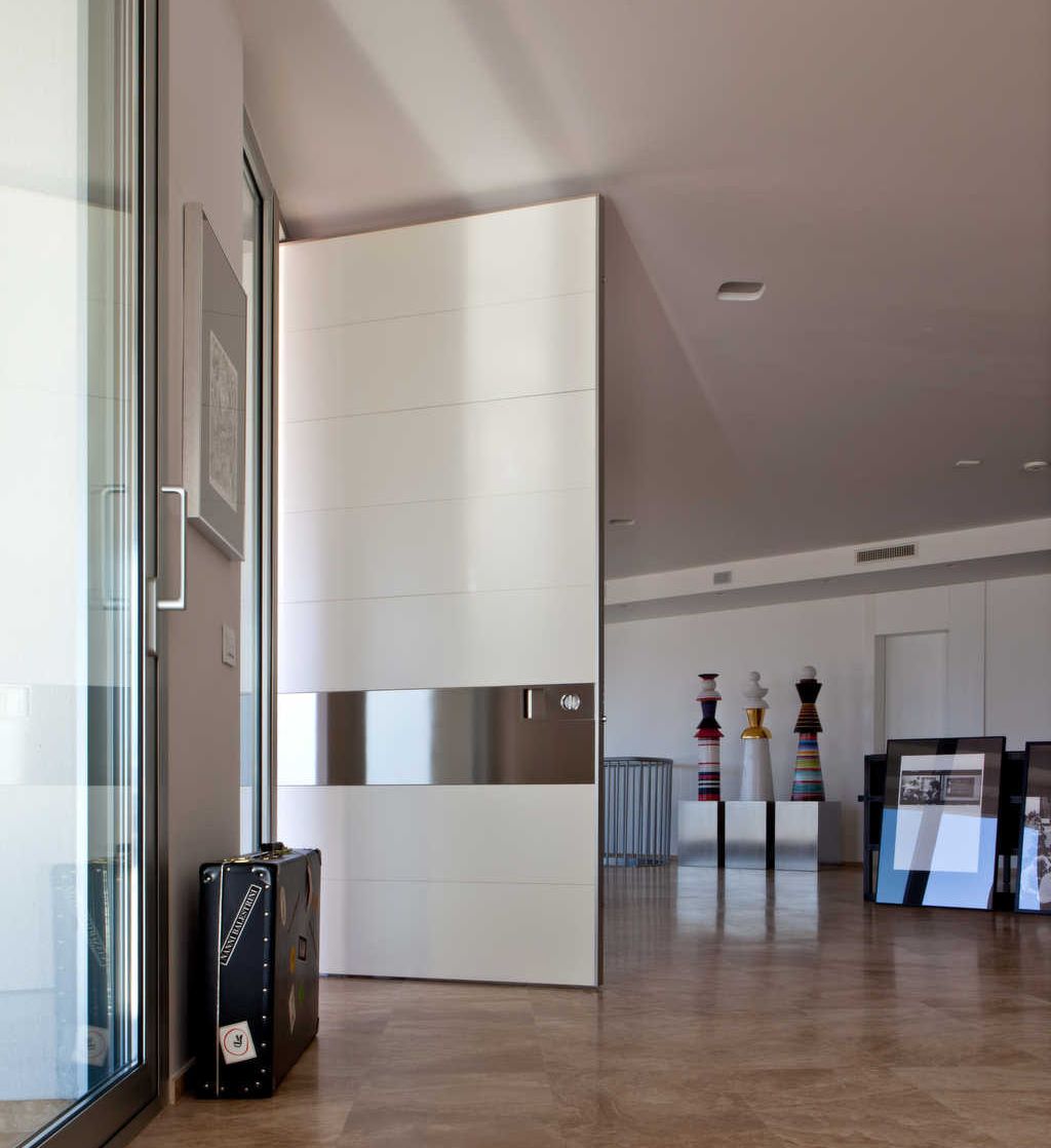 Porta d’ingresso – vista esterna ed interna. L’ingresso principale è impreziosito da Synua, la blindata a bilico per grandi dimensioni. Qui è stata scelta la versione a 8 settori nell’elegante rivestimento in rovere wengé valorizzato dalla presenza di un settore in acciaio. Il doppio fianco luce contribuisce a conferire luce e spaziosità all’ambiente, creando un dialogo tra interno ed esterno e continuità con le enormi vetrate laterali. Synua, come le altre porte di sicurezza di Oikos, consentono un diverso rivestimento tra interno ed esterno così da assecondare qualsiasi esigenza di materiali e colori. Al rovere wengè dell’esterno qui si contrappone il laccato bianco dell’interno, in perfetta armonia con la scelta degli arredi e degli allestimenti, ma anche con la luminosità del panorama esterno.