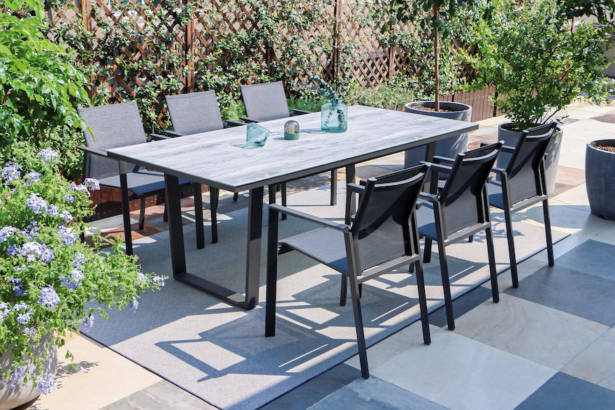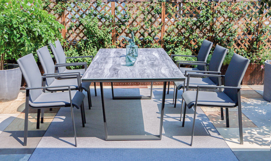 Ideale per pranzi, cene e spuntini all’aria aperta, questa linea si distingue sotto il profilo funzionale, grazie all’utilizzo di materiali che garantiscono la durata nel tempo: l’alluminio grigio antracite con cui è realizzata la sua struttura, infatti, oltre a garantirne la solidità, è altamente resistente agli agenti atmosferici.