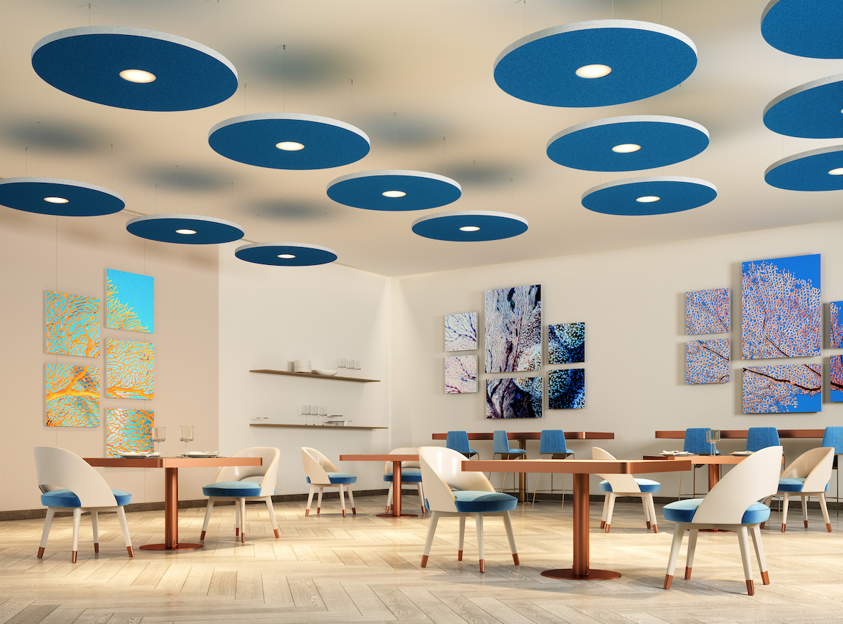 All’interno di ogni ambiente i due brand si integrano con la soluzione più adatta: per lo Spazio Food and Drink, un bistrot dove sentirsi accolti, la scelta ricadrà su Isolspace Style nel formato circolare a soffitto e a parete, che si presta quando si devono coniugare elevate caratteristiche fonoassorbenti con un design ad alto tasso di personalizzazione. Leggeri e maneggevoli, questi pannelli si applicano anche alle pareti come normali quadri.