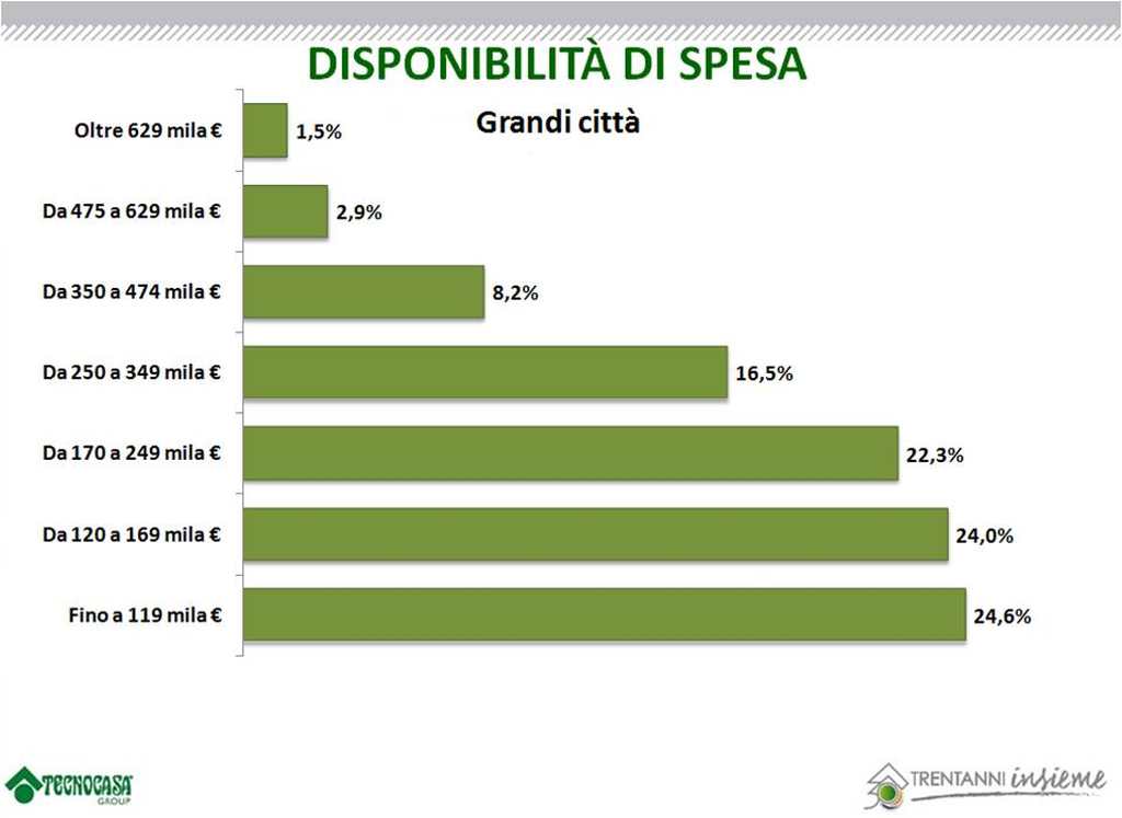 L’Ufficio Studi del Gruppo Tecnocasa ha analizzato la disponibilità di spesa a Luglio 2016. Quello che è emerso è che nelle grandi città la maggiore concentrazione della richiesta è compresa nella fascia di spesa più bassa, fino a 119mila euro (24,6%). Segue il 24,0% che si concentra nella fascia di spesa compresa tra 120 e 169 mila euro e il 22,3% di quella tra 170 e 249mila euro. Rispetto a sei mesi fa si nota un aumento della percentuale sulla classe di spesa compresa tra 120 e 169 mila euro.