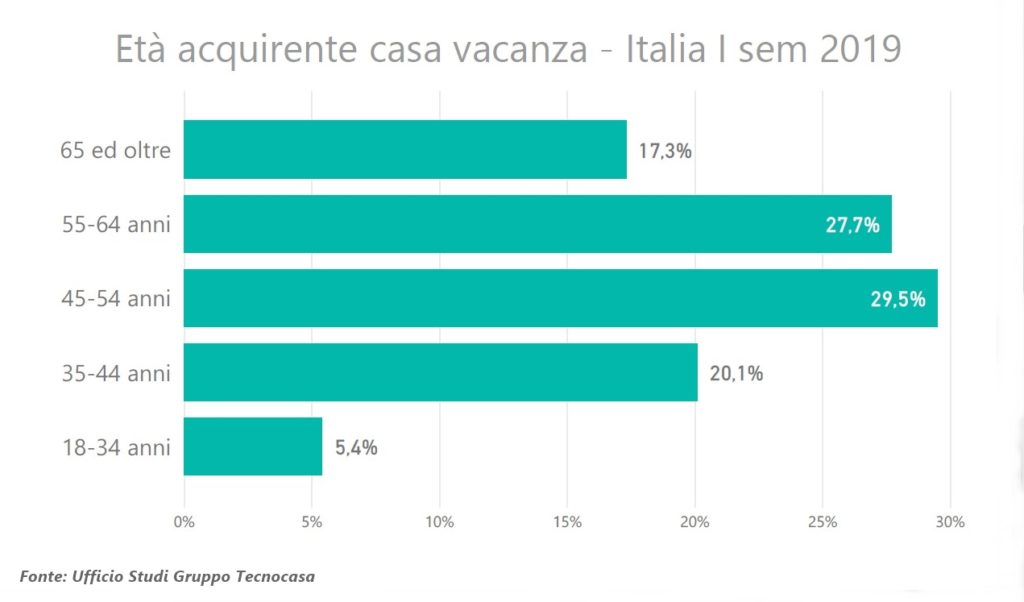 Ad acquistare la casa vacanza sono soprattutto persone d’età compresa tra 45 e 54 anni (29,5%), a seguire chi ha tra 55 e 64 anni (27,7%) e tra 35 e 44 anni (20,1%).