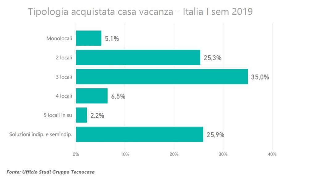 L’Ufficio Studi del Gruppo Tecnocasa ha analizzato le compravendite intermediate dalle reti Tecnocasa e Tecnorete nel primo semestre del 2019, aventi ad oggetto la casa vacanza, e ha tracciato il profilo dell’acquirente tipo e il taglio preferito. La maggior parte, il 35%, ha acquistato trilocali, mentre il 25% bilocali, molto più indietro le altre soluzioni abitative. Anche un anno fa, nel primo semestre del 2018, erano state rilevate percentuali simili.