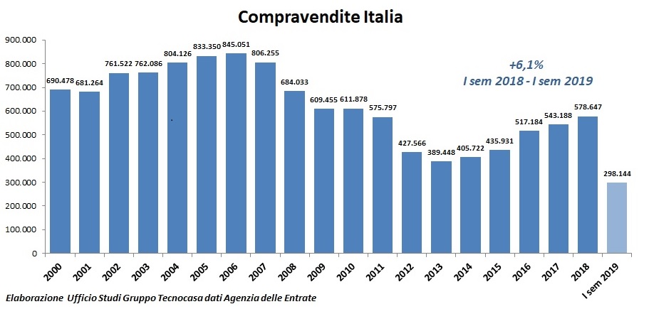 Compravendite in crescita: riteniamo che entro la fine del 2019 le transazioni possano raggiungere quota 590-600 mila.