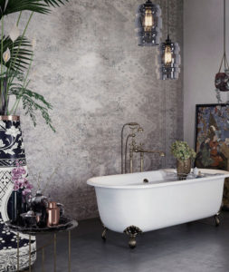 Sfumature morbide su toni freddi della scala dei grigi, dei blu e dei verdi si affiancano a quelli più caldi del beige, del rosso e dell’ocra e il richiamo all’antichità è ricreato attraverso il tessuto rovinato dallo scorrere del tempo, che regala fascino e bellezza agli ambienti.