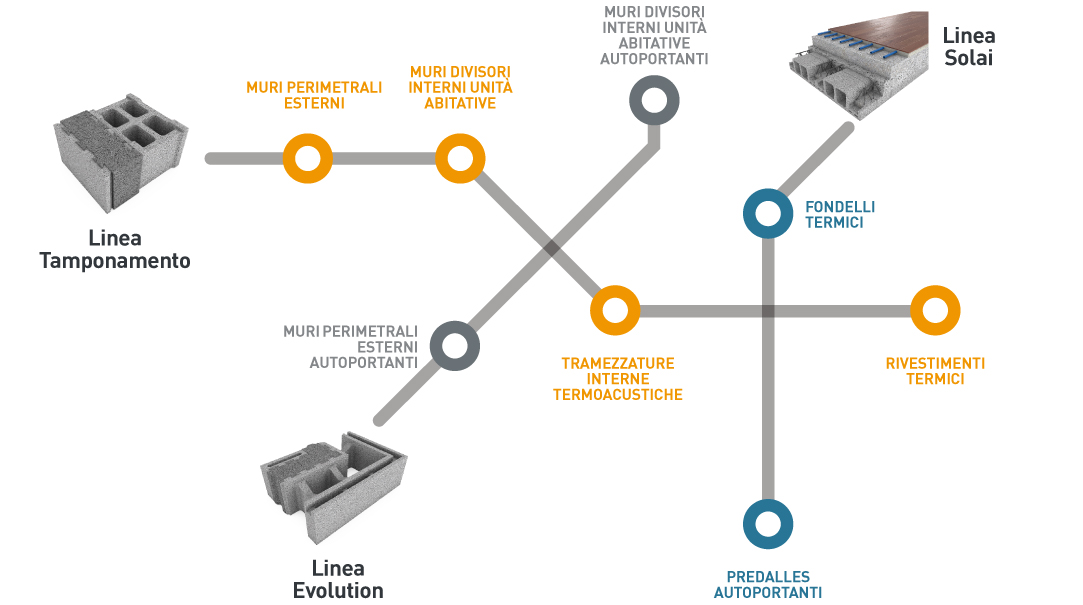 Sono tre le linee di prodotto che il sistema prevede: per il tamponamento, per la realizzazione dei solai e per la costruzione di murature autoportanti.
