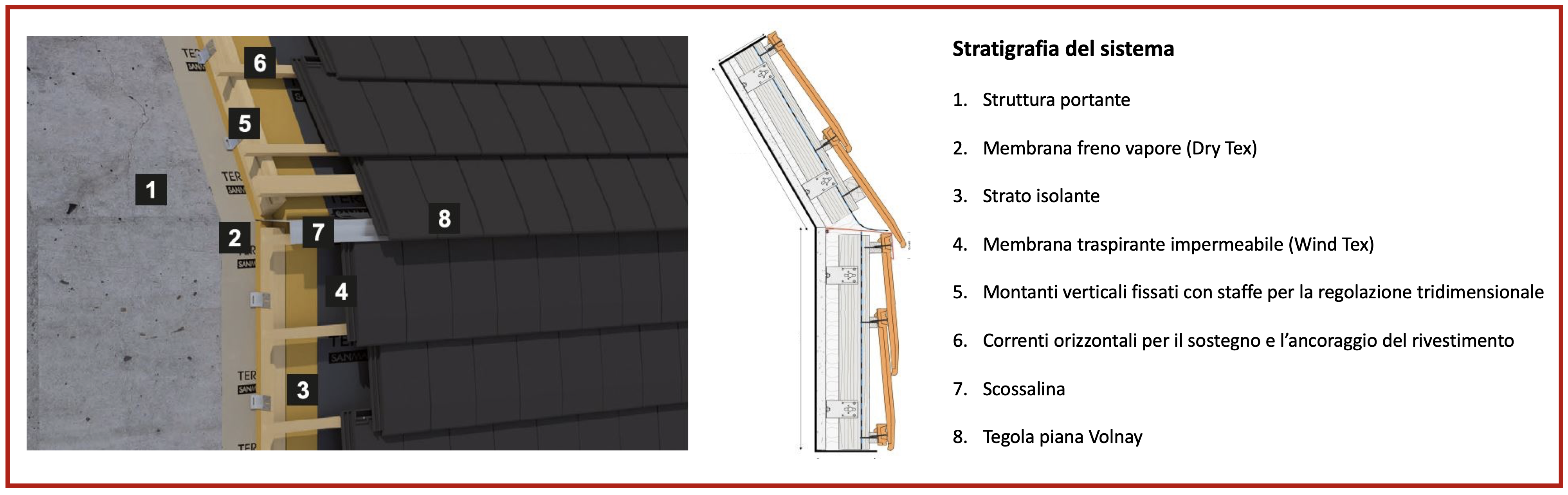 La struttura portante dell’edificio è rivestita da una membrana (Dry Tex) con funzione di freno al vapore ed uno strato isolante continuo. Completano la soluzione i montanti verticali fissati alla struttura mediante staffe con possibilità di regolazione tridimensionale. Successivamente viene posata una membrana (Wind Tex) impermeabile traspirante di tenuta all’aria bloccata da ulteriori montanti sui quali vengono fissati i correnti orizzontali per il sostegno ed ancoraggio del rivestimento di tegole piane Volnay.