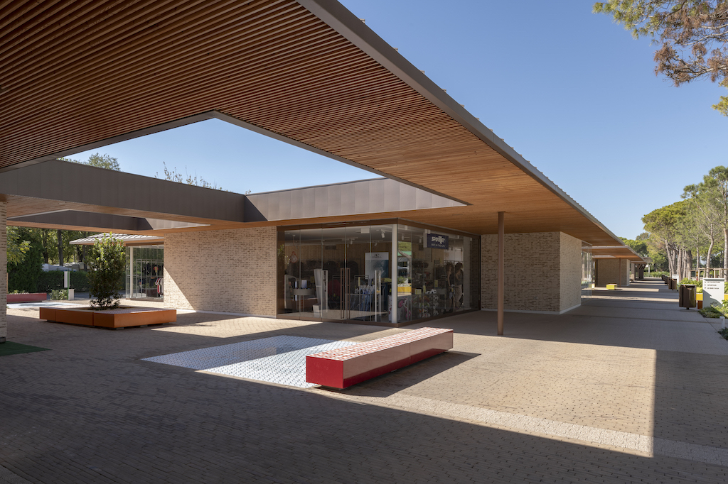 La revisione dell’area commerciale del campeggio è stata ispirata dai tradizionali mercati coperti, in cui i singoli padiglioni interagiscono sotto lo stesso tetto in modo organizzato e permeabile. I pini marittimi sono al centro dell’attenzione con le unità di vendita al dettaglio ad un piano che prendono forma attorno a loro e creano una varietà di cortili interni, piazze e aree verdi. Il design è stato guidato dall’architettura botanica, dalla sostenibilità, dalla funzionalità e dall’economicità.