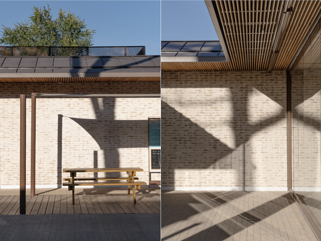 Uno stesso mattone, usato in fabbricati diversi in due modalità totalmente differenti: in alcuni punti in maniera pulita e asciutta, a creare un forte gioco di luci e ombre con l’applicazione di testa su livelli diversi, in un gioco tridimensionale, con applicazione su pannello prefabbricato; in altre parti svelato appena dall’uso di una scialbatura di malta di calce chiarissima, a richiamare murature di altri tempi, e a contrastare con le linee pulite dei fabbricati e delle vetrate commerciali.