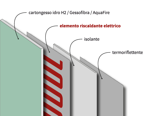 I pannelli T-panel sono composti da quattro strati di materiali: una lastra in cartongesso idro, un componente radiante impermeabile di protezione Ipx7, uno strato isolante e un foglio termoriflettente che ne massimizza la resa.
