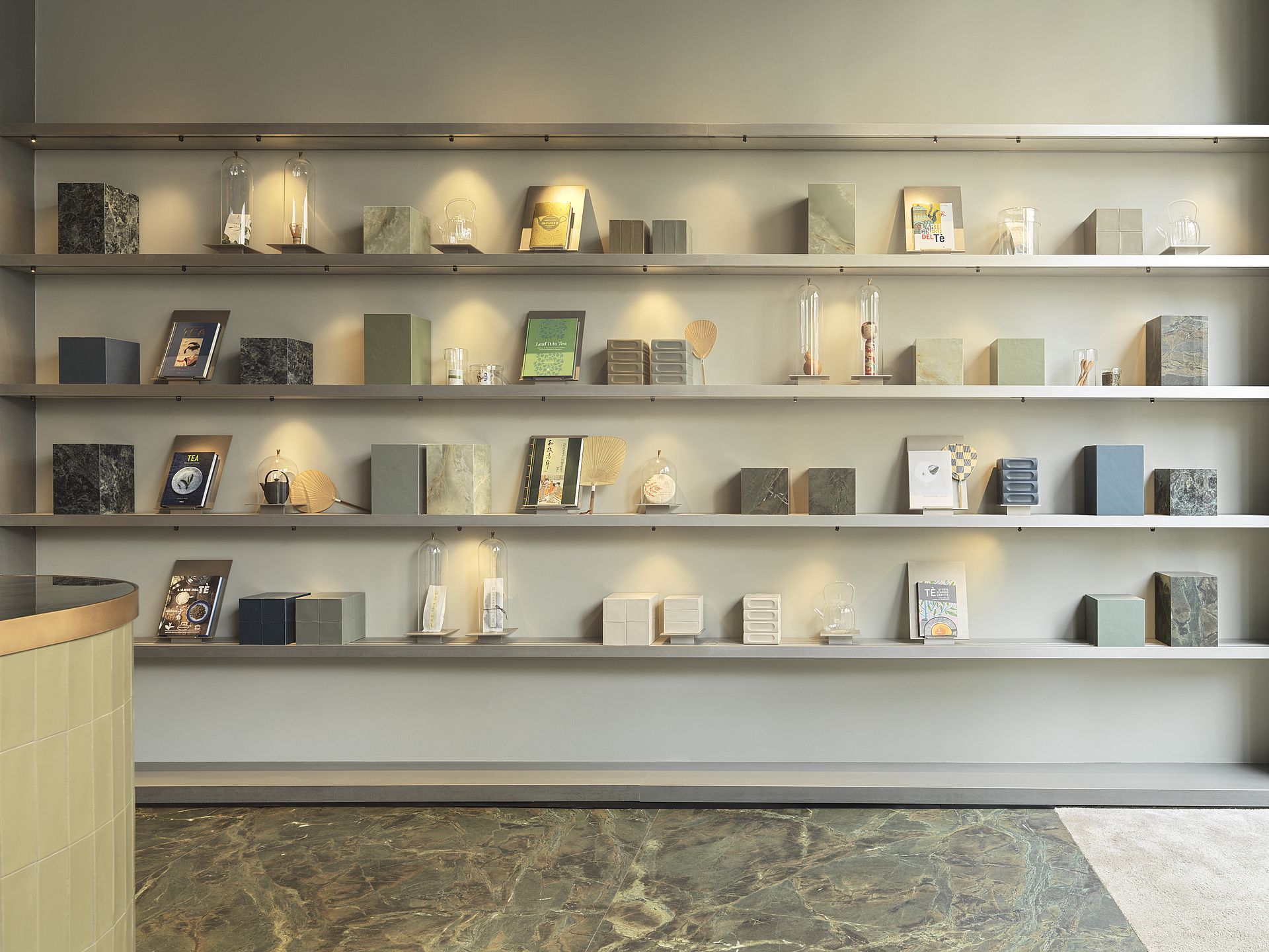 Sulle mensole, realizzate nello stesso gres Verde Borgogna, una collezione di vasi, teiere, sculture e libri dedicati al rito del te nelle diverse culture, rimanda all’accoglienza, alla convivialità, alla ricerca dell’armonia negli spazi dell’abitare attraverso l’uso di materiali sostenibili e sicuri.