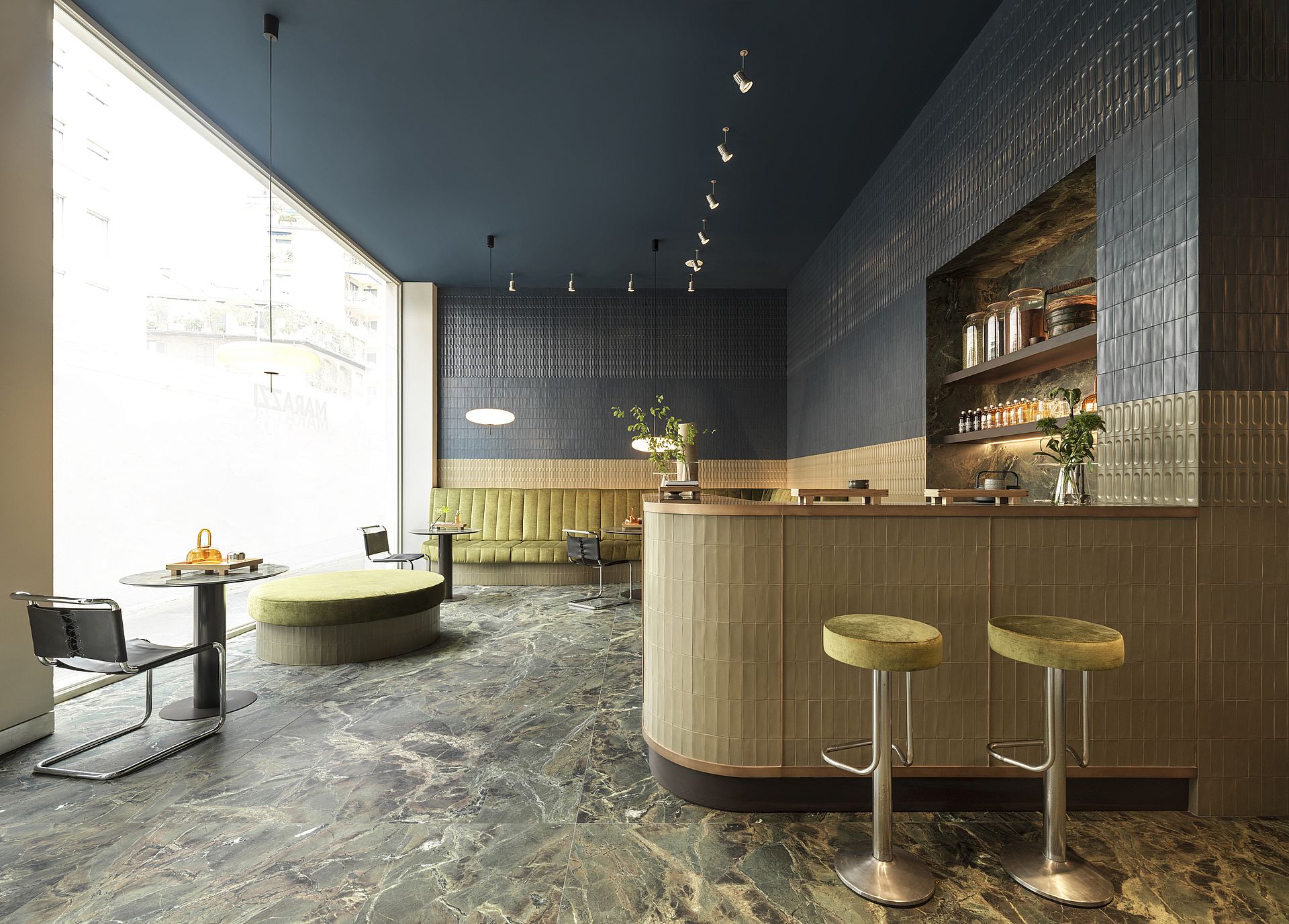 «Il progetto ‘The Green & Blue Room’ crea un ambiente intimo e accogliente. Una sala da tè raffinata, caratterizzata da una palette cromatica dai toni morbidi. Il bancone – dalle linee eleganti, con finiture in bronzo – realizzato nel gres effetto marmo che si ritrova anche sulla pavimentazione, nella parete bar e sui tavolini – si coniuga con la nuova collezione Crogiolo Confetto, in un sapiente dialogo di texture e colori. Il progetto mostra l’estrema versatilità dei materiali ceramici, che hanno ormai raggiunto un grado di sviluppo e adattabilità senza precedenti. Materiale antico ed eclettico, la ceramica apre ampi spazi di ricerca e sviluppo futuri per rispondere ad esigenze sempre nuove, mantenendo eleganza e bellezza.».