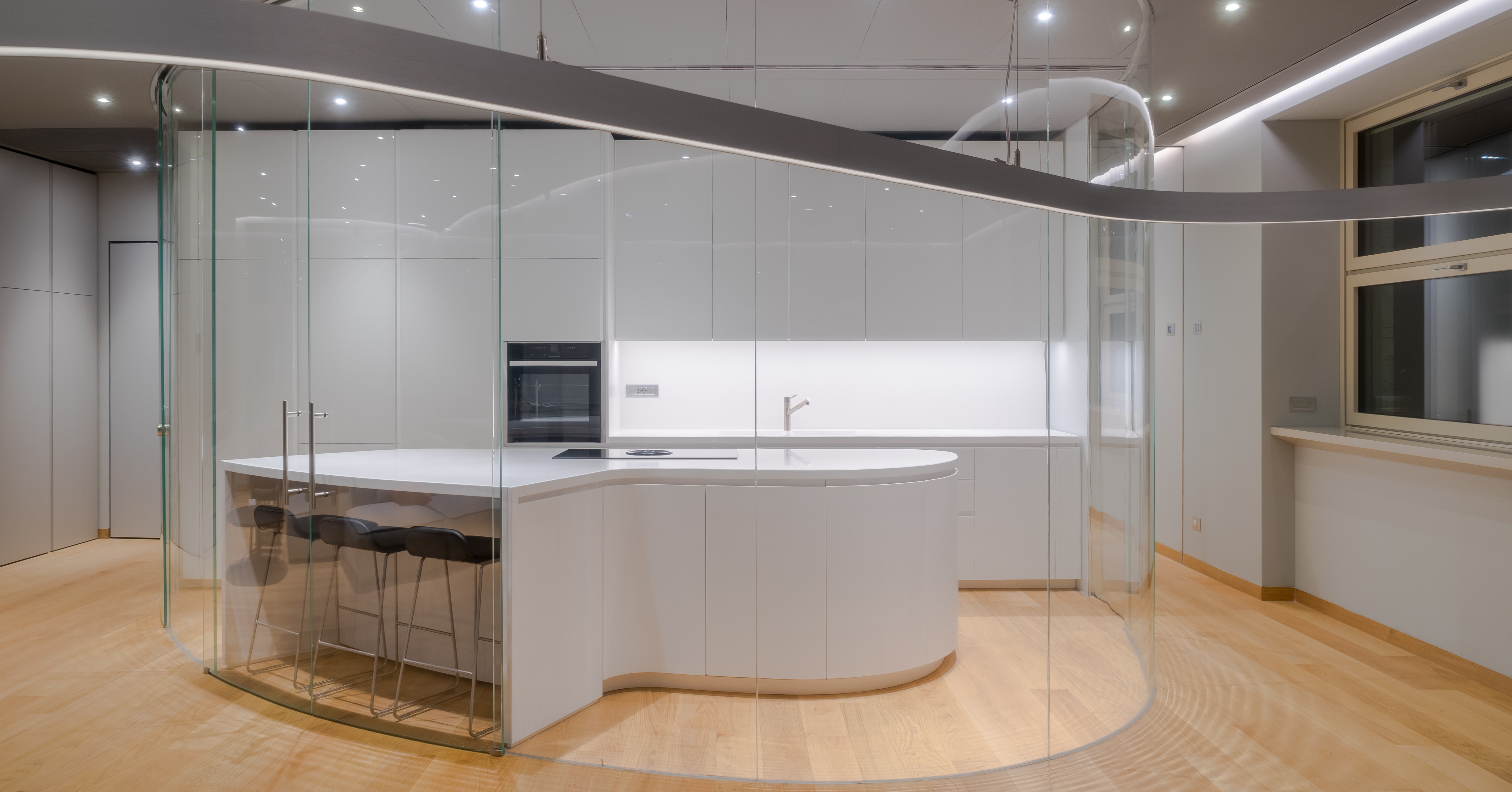 Un gioco che ha il suo apice nella bolla vetrata della cucina, volume cilindroide che si ispira alle installazioni riflettenti di Dan Graham. La cucina è un epicentro funzionale e scenografico intorno al quale ruota la zona giorno, un vero e proprio allestimento per lo showcooking e la teatralizzazione del rapporto tra chi invita e gli ospiti, anche grazie a pareti trasparenti scorrevoli che ne garantiscono la massima apertura o la chiusura funzionale.