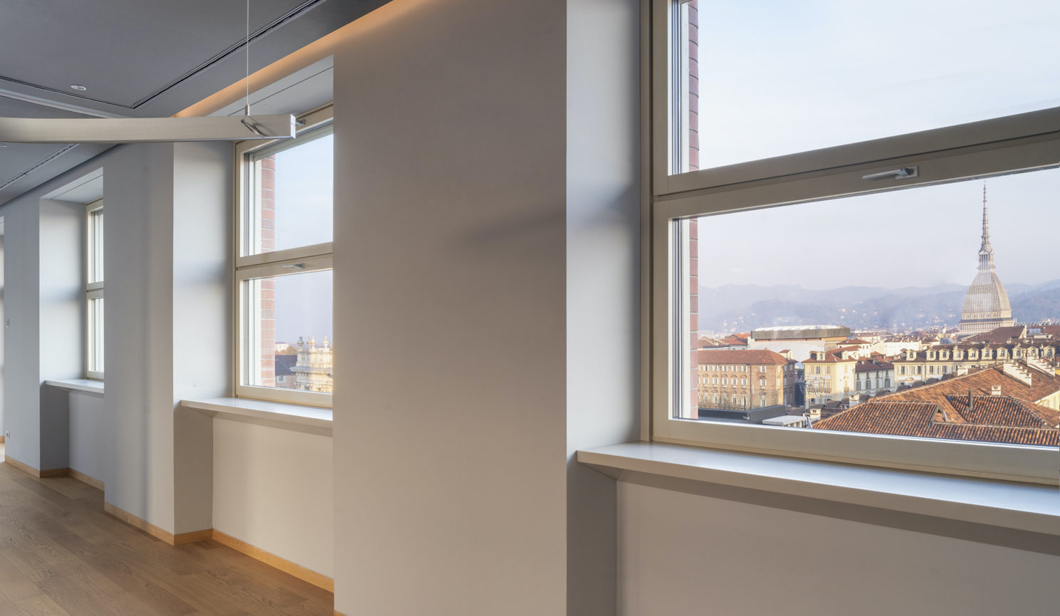 Per le partizioni opache è stata invece scelta la neutralità del grigio, scuro per i soffitti e chiaro per le pareti, in grado di restituire le variazioni cromatiche e luministiche del cielo e fungere da sfondo per la successione di finestre-quadro sulla città.