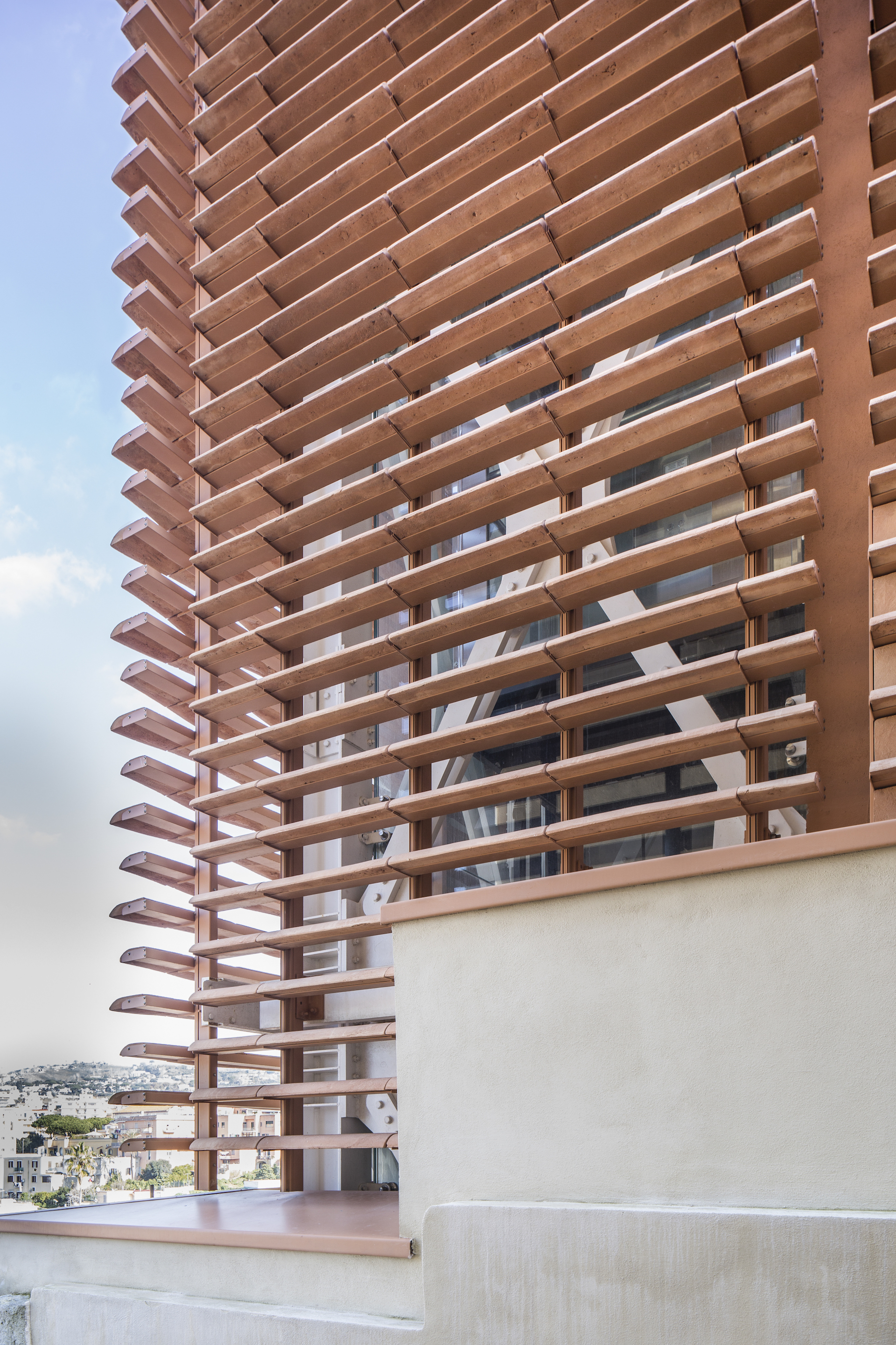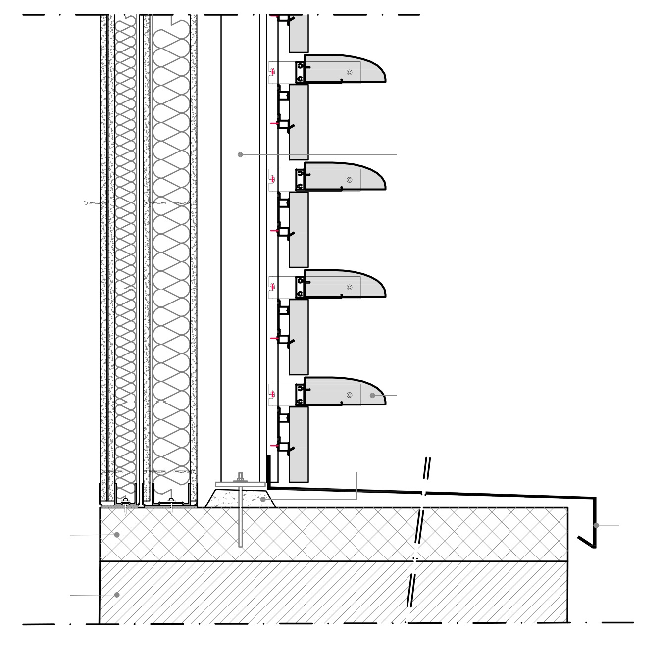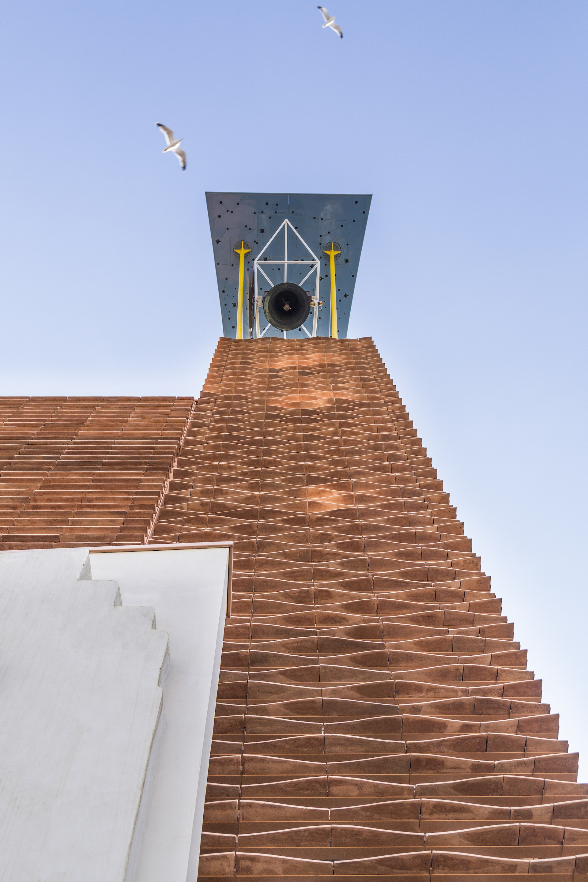 Gli elementi di rivestimento in laterizio presentano due differenti morfologie: i primi si ispirano alle onde del mare per dare movimento al volume del campanile che rimane comunque visibile nella sua interezza per la presenza degli ampi giunti vuoti, mentre sono rettilinei per il volume sottostate che restituisce un’immagine più uniforme e meno permeabile alla vista e alla luce.