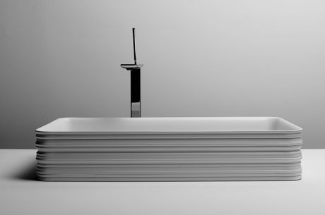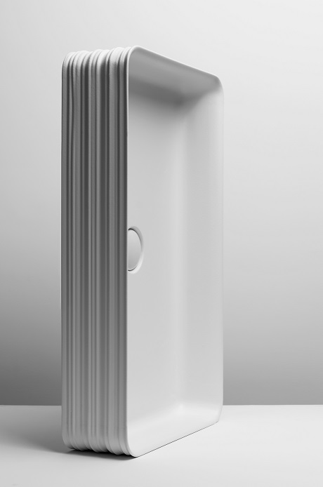 Lo schizzo di un disegno, un segno lasciato sul terreno, un’impronta, una striscia che solca una superficie, una traccia che testimonia un passaggio di qualcosa che c’era e ci sarà, che lascia un segno indelebile: Trace, progettato da V+T (Gianni Veneziano e Luciana Di Virgilio) per Valdama, è un lavabo scultoreo dall’immagine inedita, un volume sottoposto al flusso del tempo e dell’acqua che hanno generato una sottrazione scultorea nella materia.