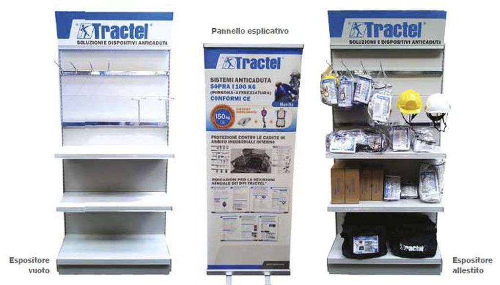 Tractel fornisce ai punti vendita distributori dei suoi prodotti, degli espositori a scaffale dotato di pannello esplicativo che consente di orientare il cliente nella scelta dei dispositivi più adatti.