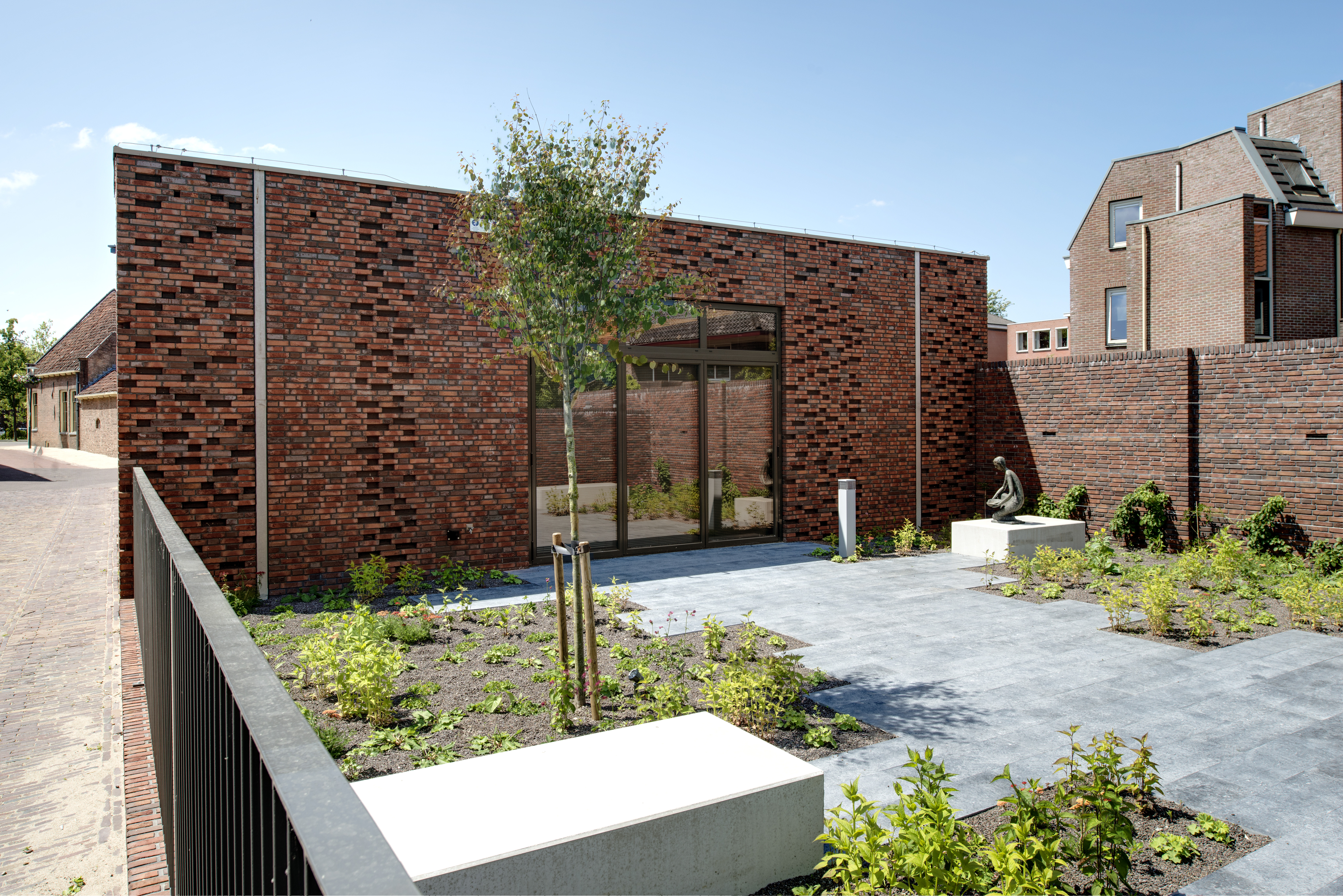 All’esterno, per sottolineare il legame con il contesto e, in particolare, con l’edificio preesistente, il nuovo volume prevalentemente in vetro è stato completamente schermato con un paramento in mattoni di laterizio faccia a vista. La cortina esterna è una vera e propria pelle che avvolge l’intero volume, a eccezione del lato in cui è collocato l’ingresso, con un linguaggio contemporaneo che però richiama l’architettura rurale con soluzione a «gelosia». Il paramento risulta quindi caratterizzato da un alternarsi di «strisce» verticali di superficie opache e traforate, dove in realtà il mattone è in alcuni casi assente e in altri semplicemente arretrato e in grado di generare comunque degli interessanti effetti chiaroscurali. Alla texture è quindi attribuito il compito di caratterizzare lo schermo con una successione di sequenze e disegni: attraverso il tessuto narrativo della texture il mattone sembra abbandonare la staticità tipica di una tessitura muraria per definire una trama ritmata e ascensionale.