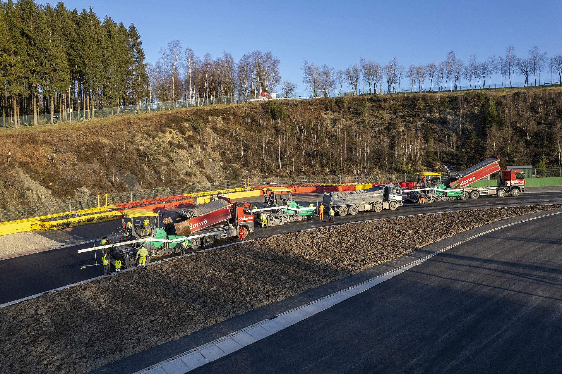 Dalla ripida Eau Rouge salendo fino alla chicane più famosa della Formula 1, la curva parabolica Raidillon, si doveva stendere un nuovo manto d’usura di 505 metri. A questo si aggiungevano i 206 metri in prossimità della curva di Formula 1 T9Car a nord nonché le nuove curve dedicate alle moto T8Moto e T9Moto su una lunghezza di 701 metri.