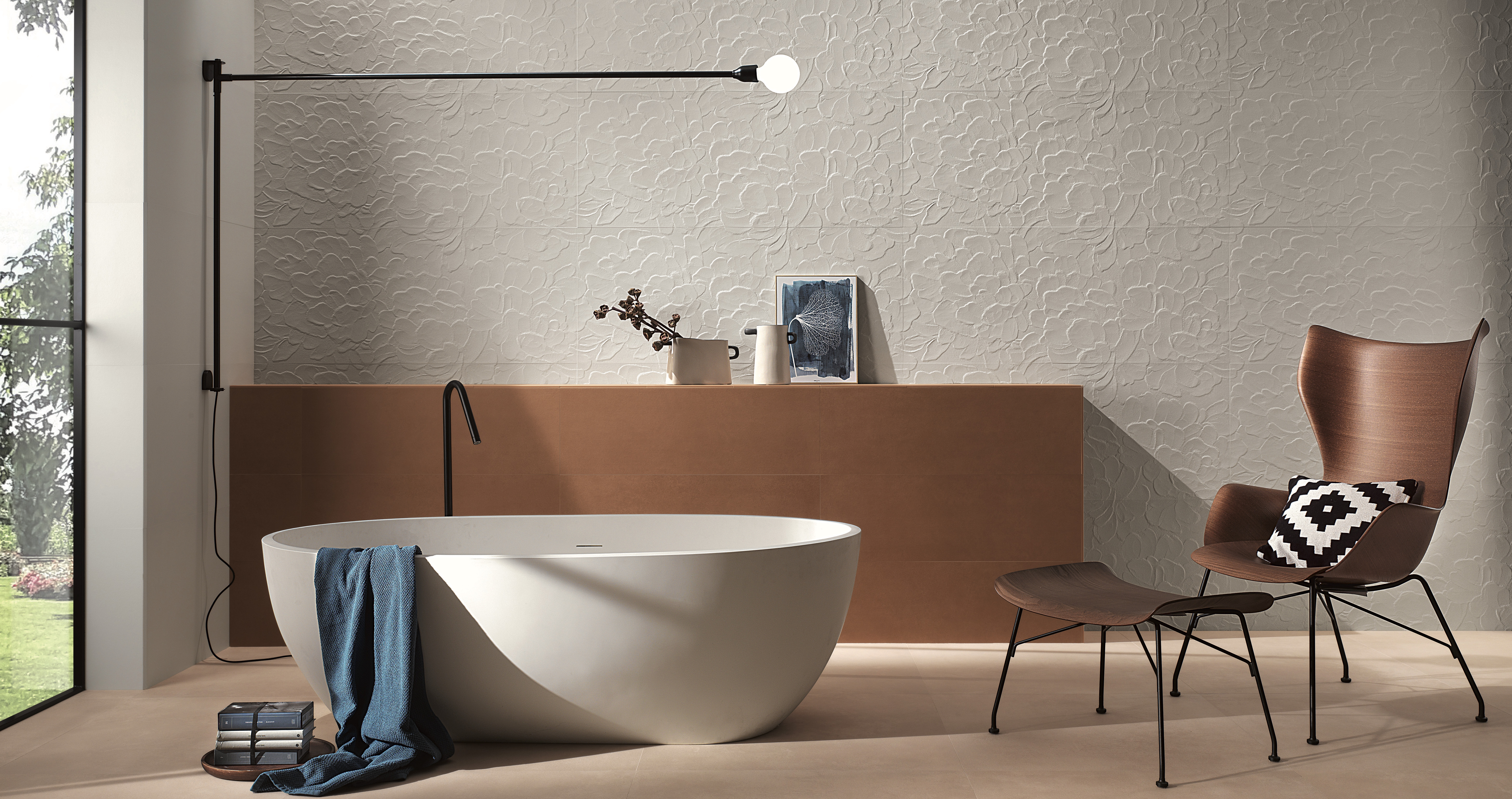 La contemporaneità della collezione si esprime attraverso un match di stili e ispirazioni che portano la natura indoor. Con colpi di spatola – come artisti sulla sabbia – è stata creata Blossom: una piastrella materica ispirata alla delicatezza dei petali di fiore che esprime al meglio la lavorazione della sabbia mescolata alla polvere di marmo.